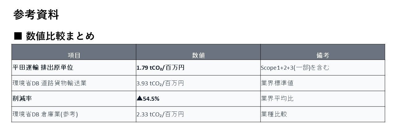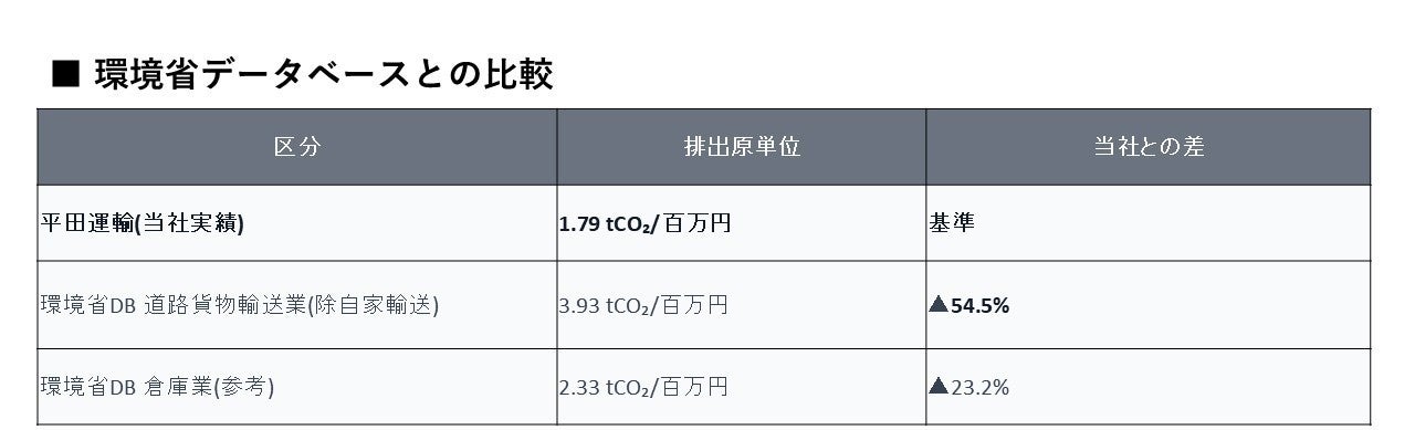 企業別排出原単位 1.79tCO₂/百万円は環境省DB 道路貨物輸送業排出原単位 3.93 tCO₂/百万円の半分以下