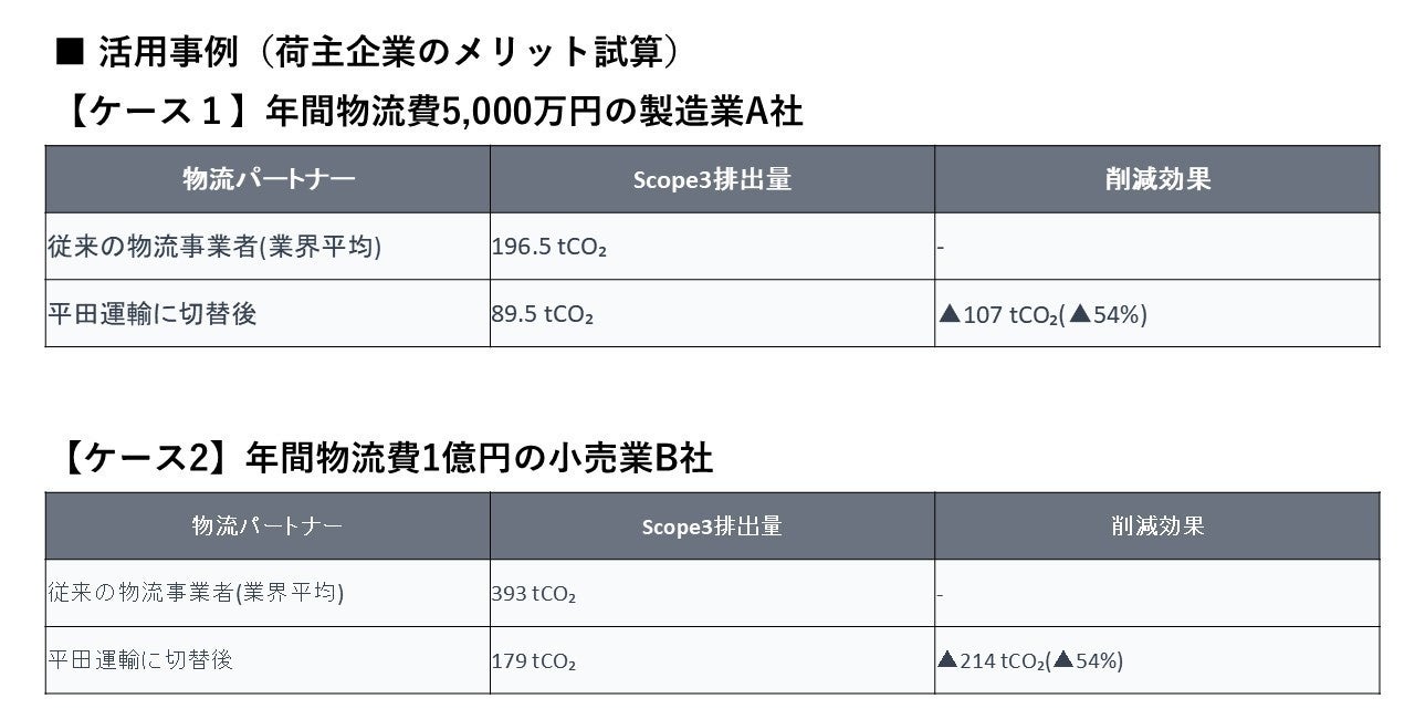 荷主企業の皆様にとって、当社との取引は、物流パートナーを変更するだけでScope3排出量を半減できるという、即効性のある脱炭素施策となります。