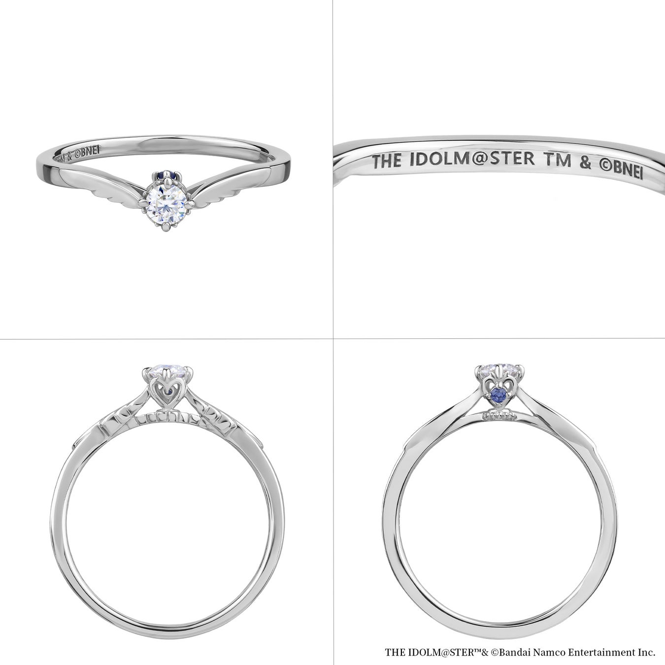ペガサスマークからインスパイアされたハートと羽をメインに、「アイドルマスター シンデレラガールズ」を象徴するような魅力的なデザインに仕上げました。センターには地球上で最も輝くと言われる「モアサナイト」をセッティングし、何よりも輝きを放つアイドル達と、何年経っても変わらないプロデューサーの絆を表しています。また、石座側面にはプラチナ900はサファイヤ、シルバーはサファイヤカラーのキュービックジルコニアをセッティングしました。アームにはペガサスの羽をデザイン。プロデューサーによって成長し、大きく飛躍していくアイドル達の姿をイメージしています。繊細かつ立体的なデザインで高級感溢れるリングは、プロデューサーとアイドル達が歩んできた軌跡を象徴しているのはもちろん、プロデューサーが普段使いでおしゃれに着けて楽しむこともできるアイテムです。