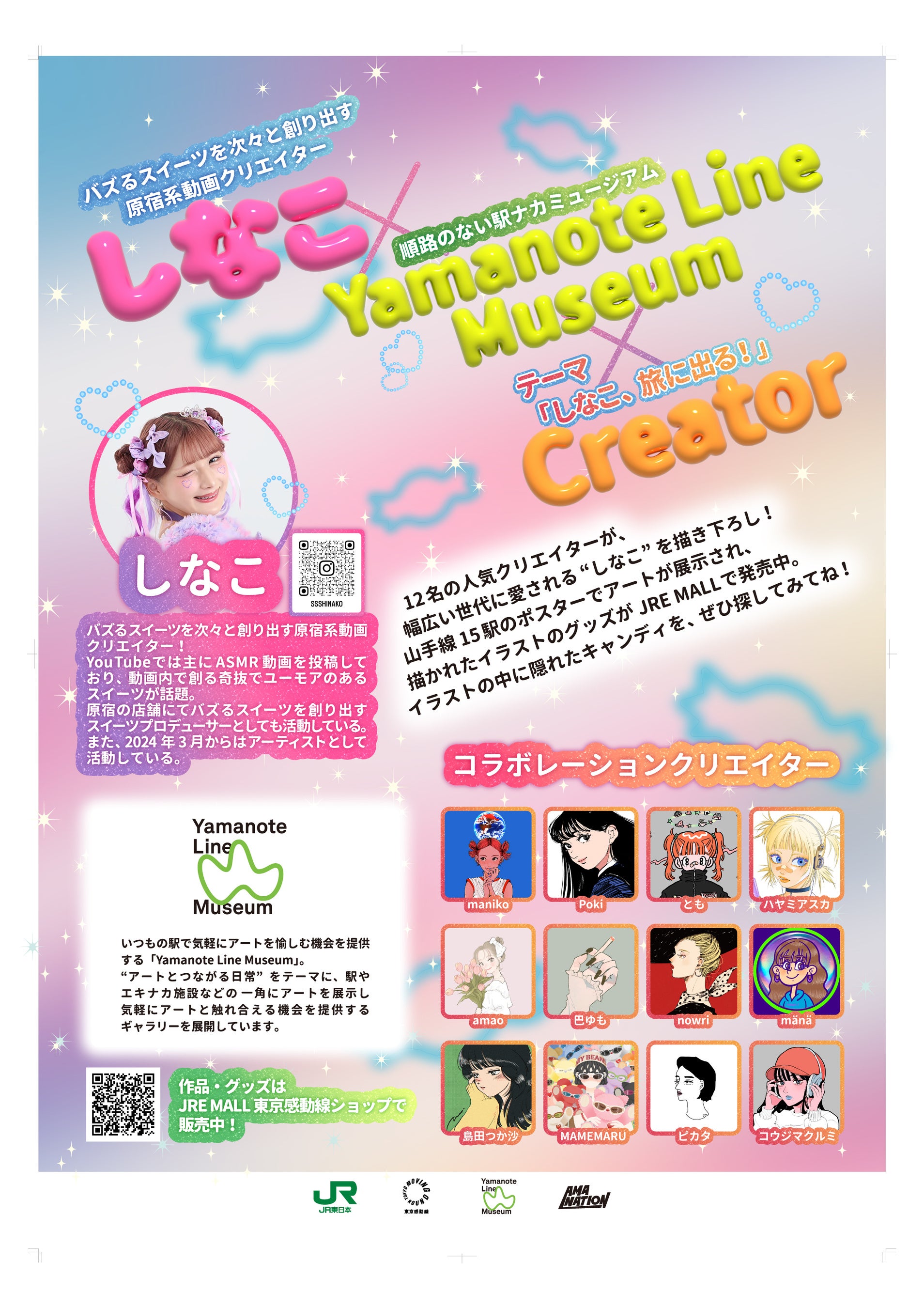株式会社AMANATION(本社:東京都渋谷区、代表取締役:小島純矢・北尾周也)は、JR東日本 東京感動線が推進する「Yamanote Line Museum」において、原宿系動画クリエイター“しなこ”と、nowri、ピカタ、Pokiら当社所属の総勢12名の人気クリエイターによるコラボレーション企画のアートディレクションを担当しました。