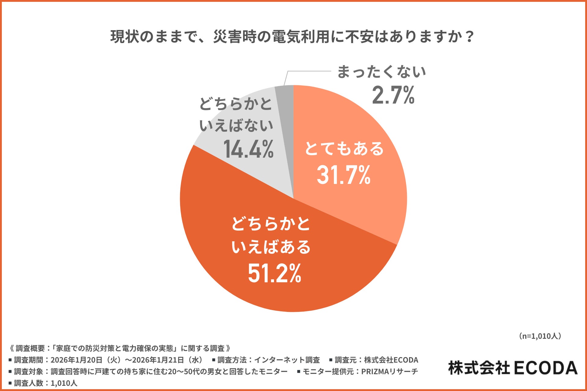 そこで今回、太陽光発電と蓄電池施工を専門に手がける株式会社ECODA(エコダ)は、戸建ての持ち家に住む20〜50代の男女を対象に、「家庭での防災対策と電力確保の実態」に関する調査を行いました。