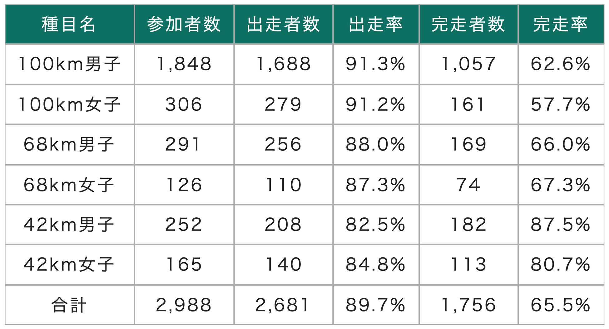 エントリー数は2,988名、当日出走者2,681名、うち完走者1,756名(完走率65.5%)。