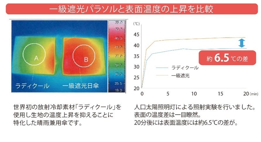 一級遮光パラソルと表面温度の上昇を比較。人工太陽照明灯による照射実験を行ったところ、20分後には表面温度に約6.5度の差が発生。炎天下でも快適に過ごせます。