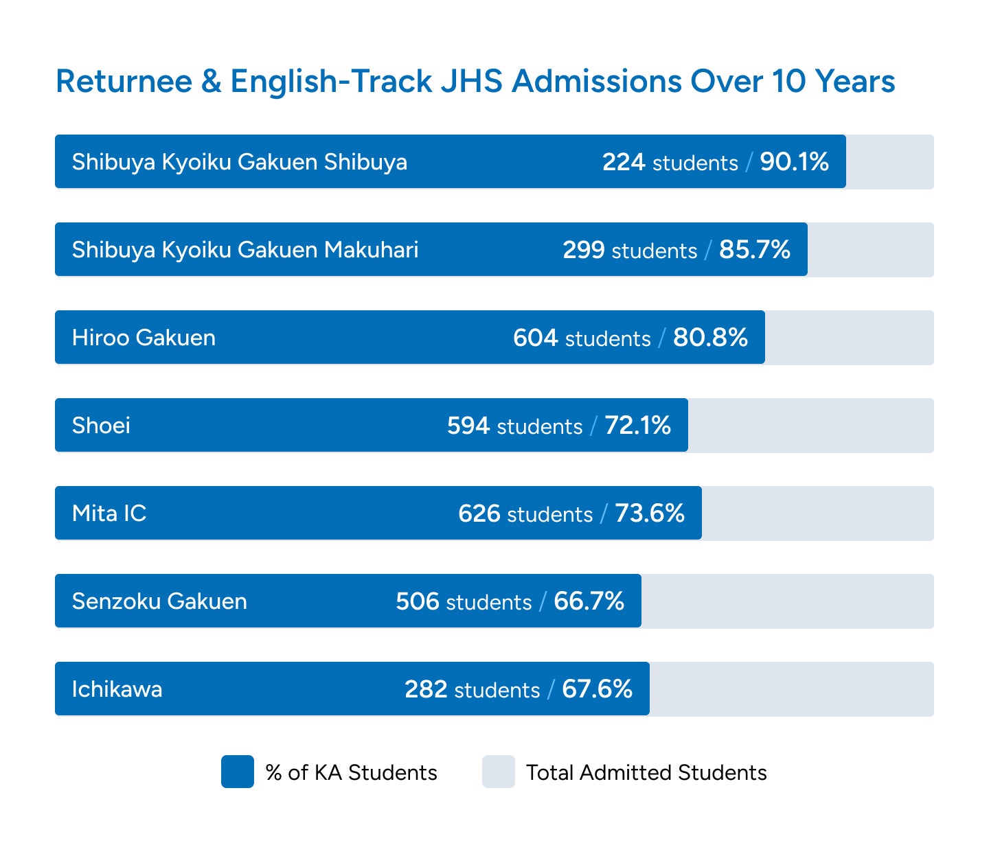 The data shows that KA students have consistently made up a significant proportion of successful applicants at highly competitive schools offering English-based entrance exams. Notably, over the most recent five-year period (2021–2025), this proportion has risen further at schools including Shibuya Kyoiku Gakuen Shibuya, Shibuya Kyoiku Gakuen Makuhari, and Hiroo Gakuen.