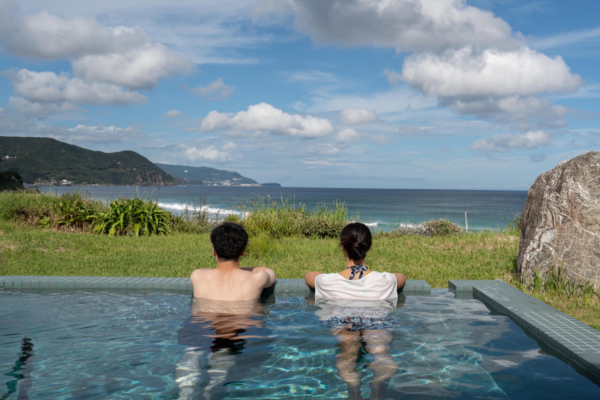 水平線を望める最高の景観で、白浜の波音を聞きながら外気浴をお楽しみいただけます。