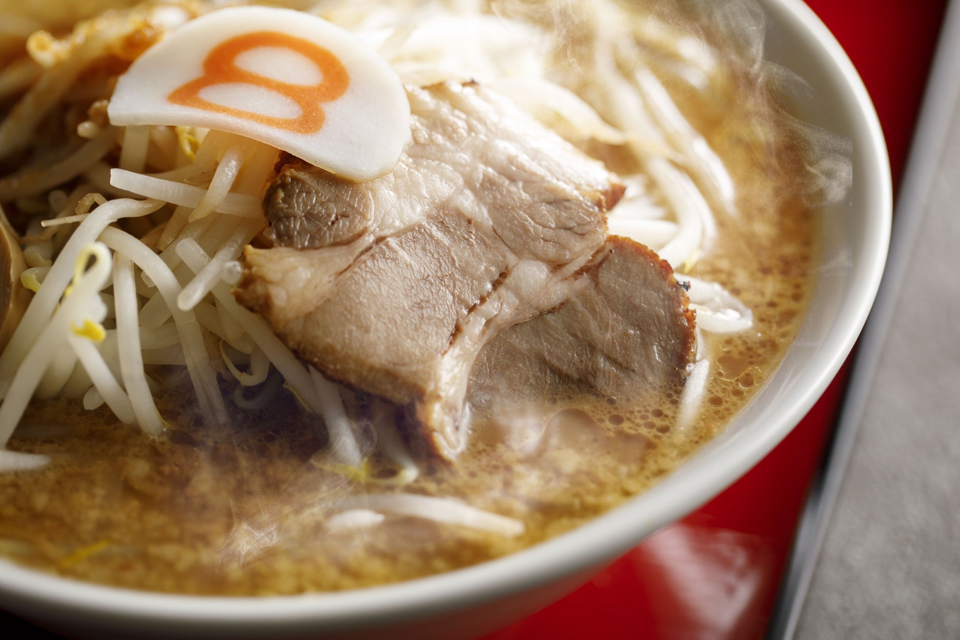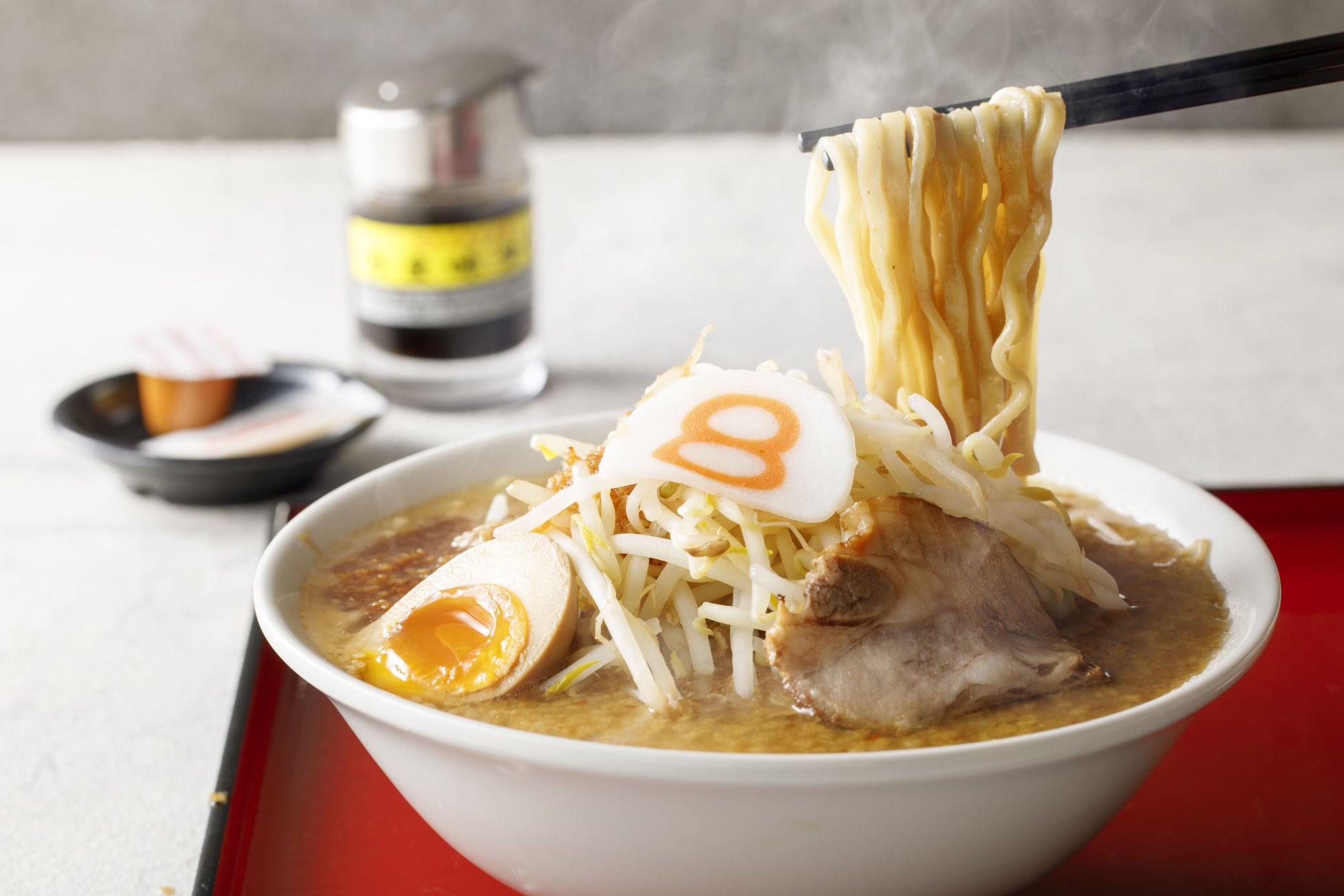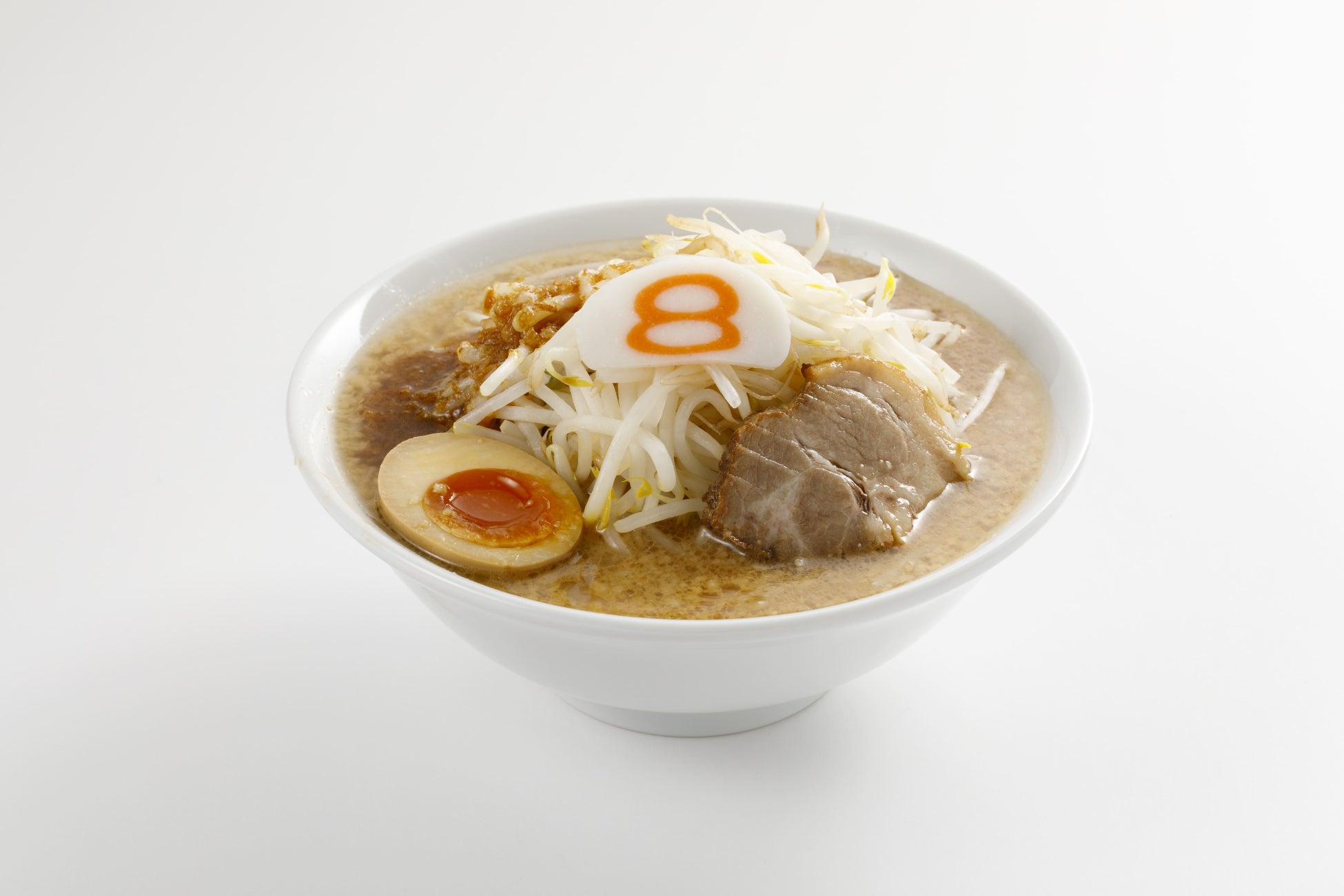 北陸の8番らーめんでは食べることができない国産小麦100%の極太麺を使用し、厚切りチャーシューや煮玉子、もやしで食べ応えを追求。