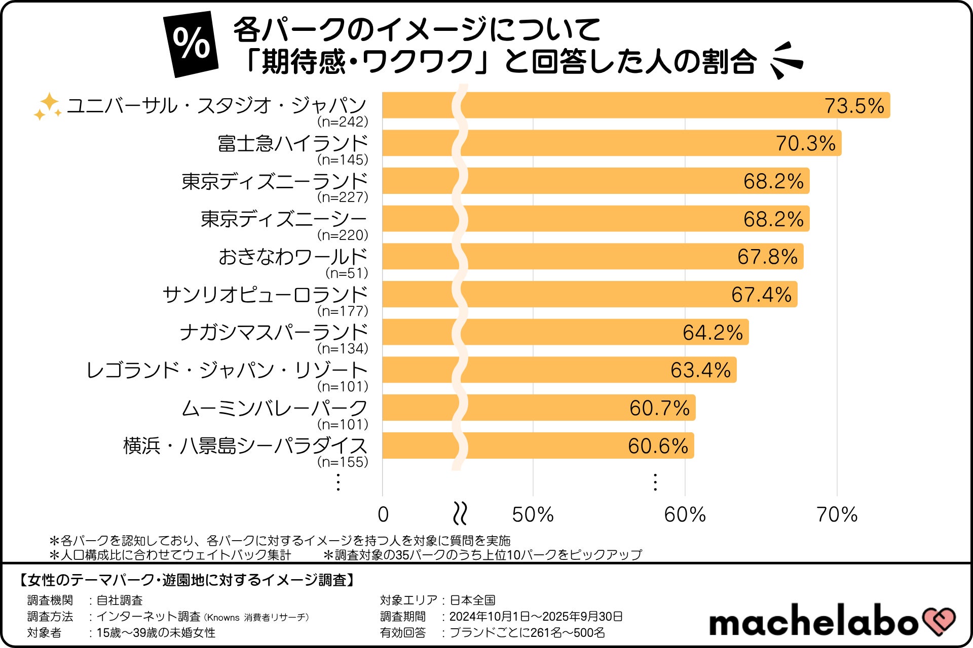 そこで、株式会社マシェバラトークが運営するオウンドメディア『マシェラボ』( https://machetalk.jp/media/ )は、全国の15歳~39歳の未婚女性を対象に、国内の主要なテーマパーク・遊園地に関するイメージ調査を実施しました。