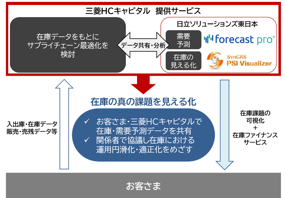 このような状況を受け、三菱HCキャピタルは、企業の在庫適正化を起点としたサプライチェーン全体の最適化に貢献すべく、本サービスの提供を開始しました。本サービスの提供にあたっては、日立ソリューションズ東日本が流通・製造業向けに開発した生販在(生産・販売・在庫)可視化・調整ソリューション「SynCAS PSI Visualizer」および需要予測支援ソリューション「Forecast Pro」を活用しています。