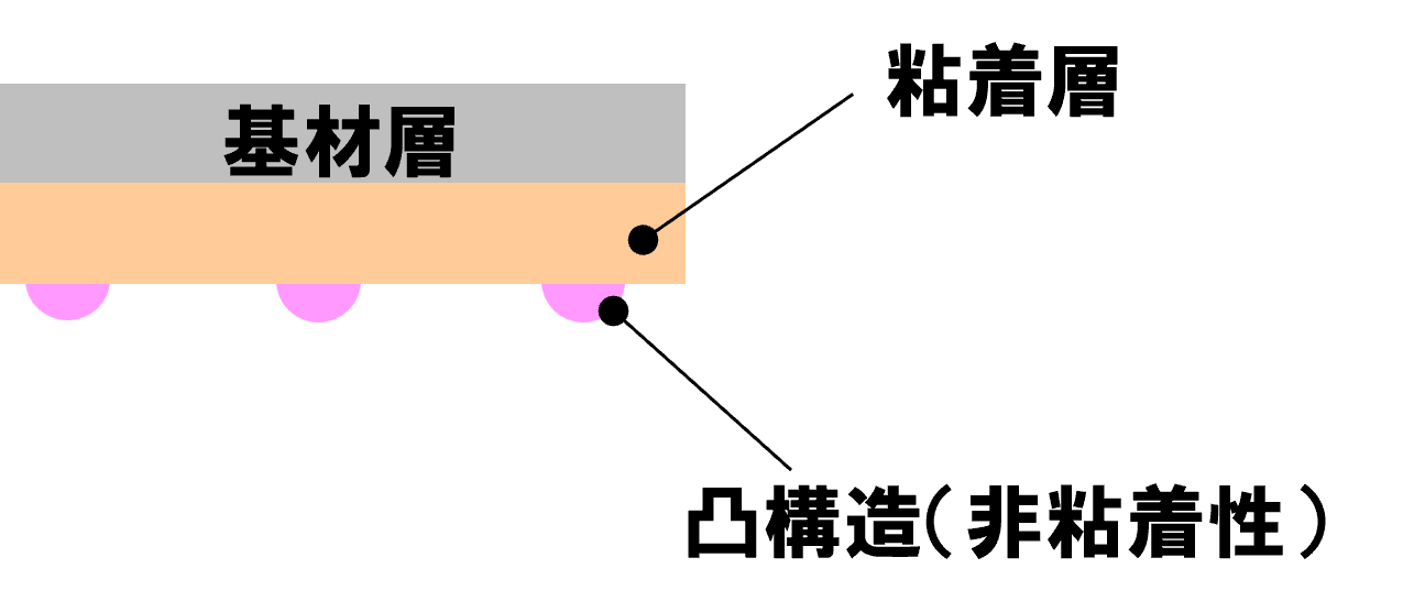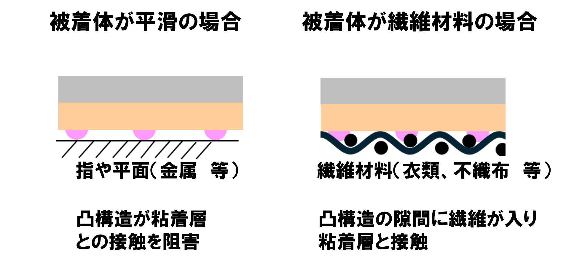 このたび東レが開発した粘着フィルムは、離型紙を使わずに粘着面を保護できる点に特徴があります。粘着層の上にミクロンサイズの凸構造(非粘着部)を設けた立体的な表面構造を採用し、この凸構造が粘着層への不用意な接触を物理的に阻害することで、未使用時のべたつきを防ぎます(図1)。そのため、指や、金属やプラスチックなどの平滑面では、凸部分のみが当たるため粘着層に触れず、さらさらとした触感が保たれます。一方、布や不織布などの繊維製品では、繊維が凸構造の隙間に入り込んで粘着層と接触し、高い密着性が得られます。こうした表面構造の制御により、布にはしっかり貼りつき、平滑面には付かないという選択的粘着性を実現しました(図2)。