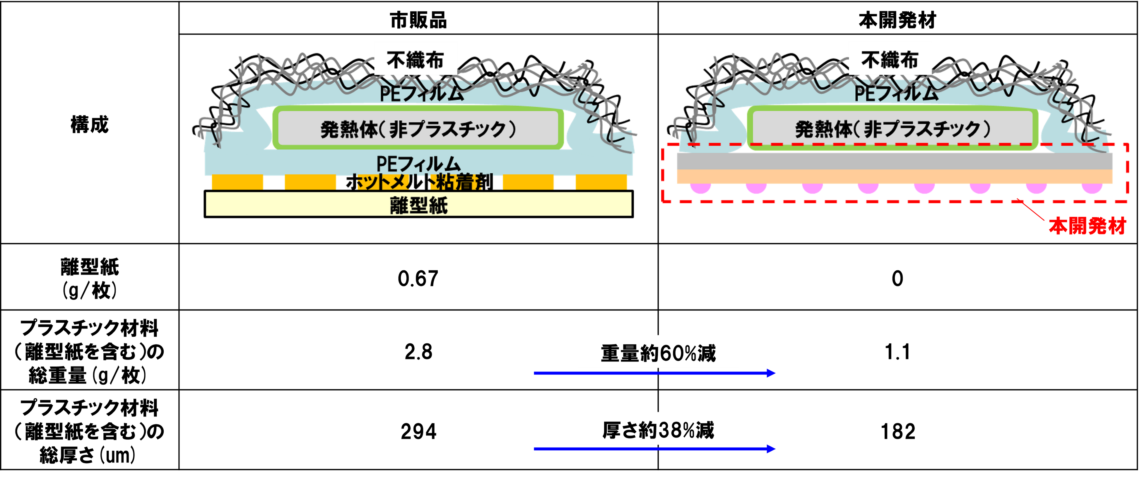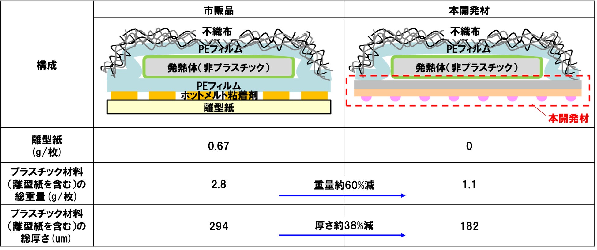 一例として、本開発材を「貼るカイロ」に適用して離型紙レス構成とした場合※4、年間約247tの離型紙ゴミの削減効果が見込まれます。また、既存品に比べ、発熱体を除いたカイロの総重量を約60%、厚みを約38%削減でき、製品のコンパクト化と環境負荷低減を同時に実現します。