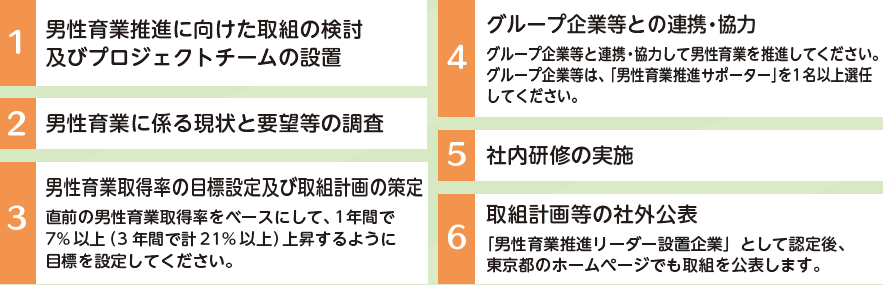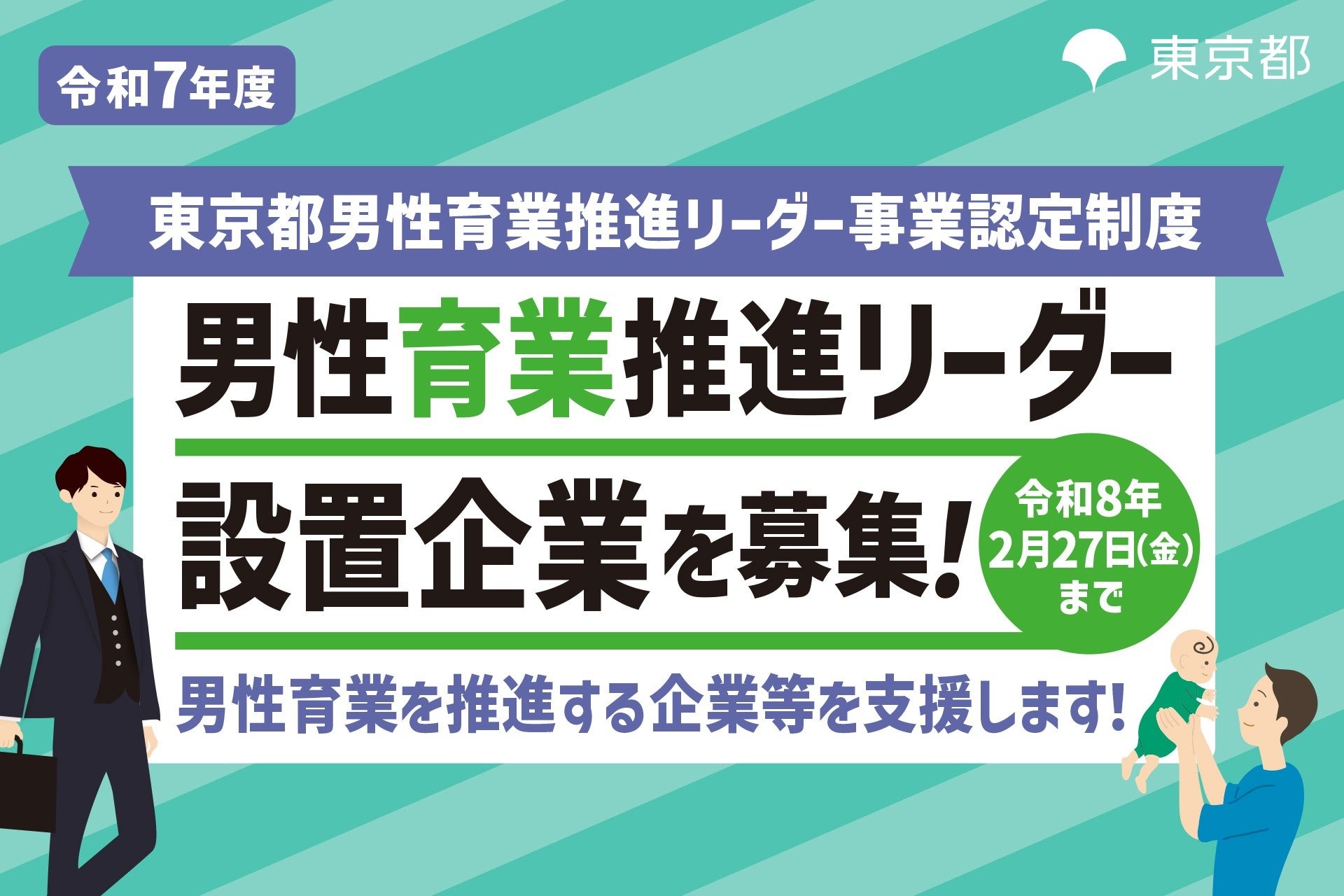 東京都では、都内企業の男性育業取得率向上を目指し、「男性育業推進リーダー設置企業」認定制度を行っています。
