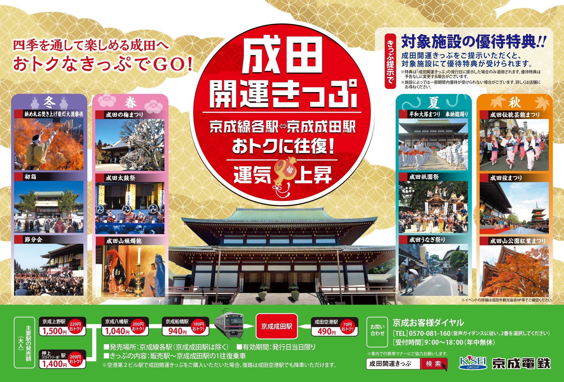 また、大晦日の終夜運転時と正月三が日および1月中の土曜・休日には、スカイライナー車両を使用した全席座席指定で快適・便利な成田山開運号を上下各1本臨時運行いたします。多くの参詣客で賑わう成田山新勝寺への初詣のみならず、都内行楽地へのお出かけ等、多くのお客様のご利用を心よりお待ちしております。