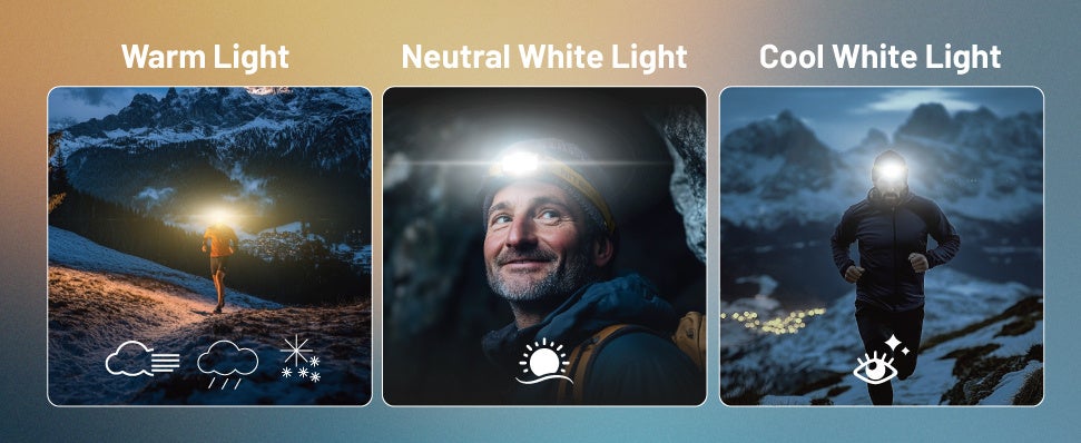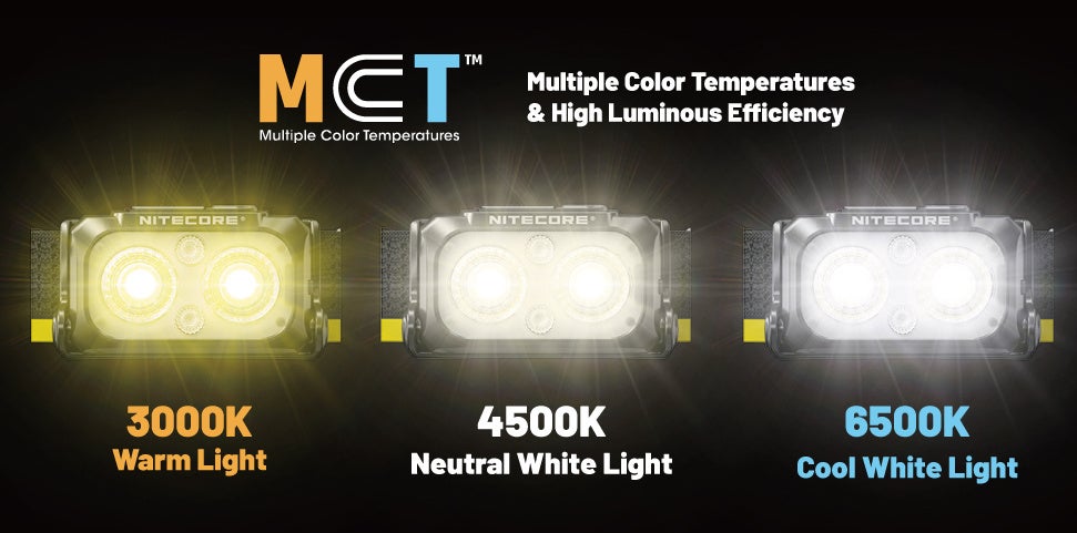 NITECOREの中でも注目して欲しい機能のひとつが「MCT(Multiple Color Temperatures)」です。MCTとは、ひとつの光源で「ウォーム」「ニュートラル」「クール」の3種類の光色を自在に切り替えられる画期的な機能のこと。シーンや天候に合わせて最適な光を選ぶことができるのです。
