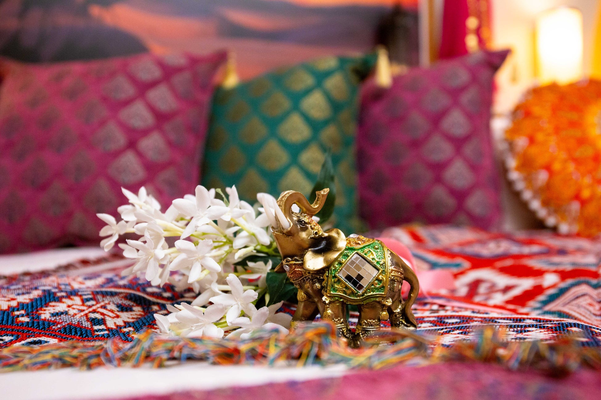 そこはまるで、広大な砂漠を望む優美な宮殿の一室。壁面には砂漠の夕暮れに浮かぶ大きな月が描かれ、幻想的な光を放つランタンや色鮮やかな装飾がアラビアンの世界へと誘い、特別なひとときを彩ります。撮影用小物としても使用できるジャスミンのブーケもご用意。物語の世界に迷い込んだような、異国情緒あふれる空間で優雅なホテルステイをお楽しみください。
