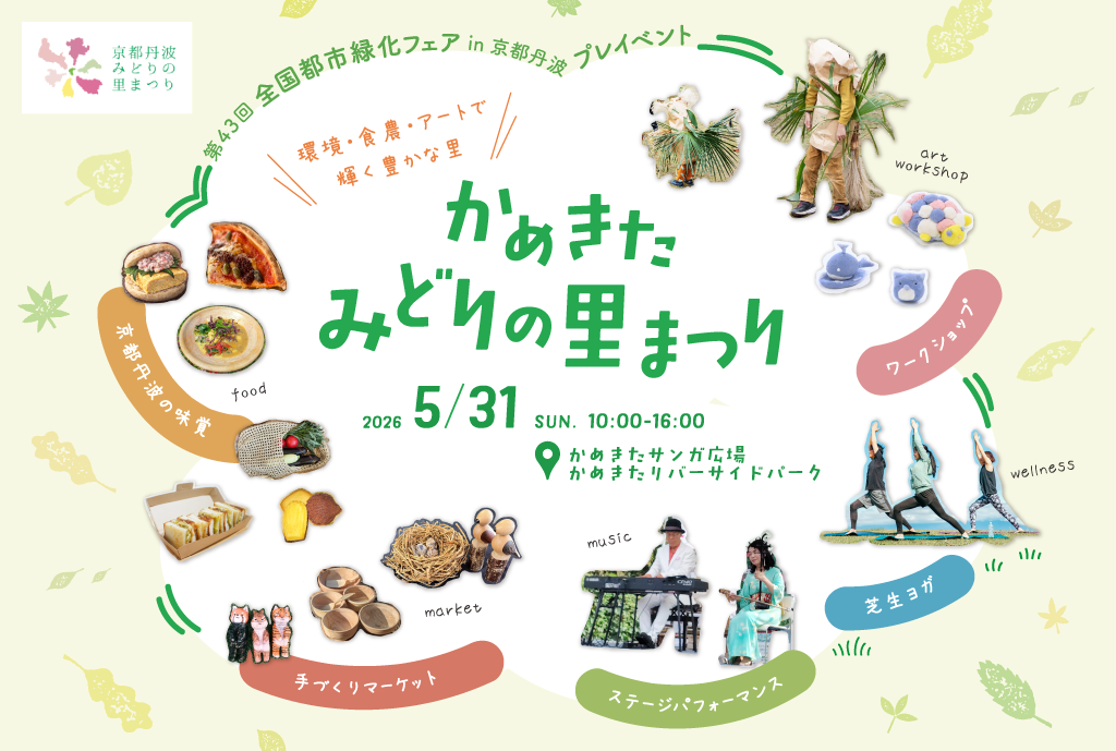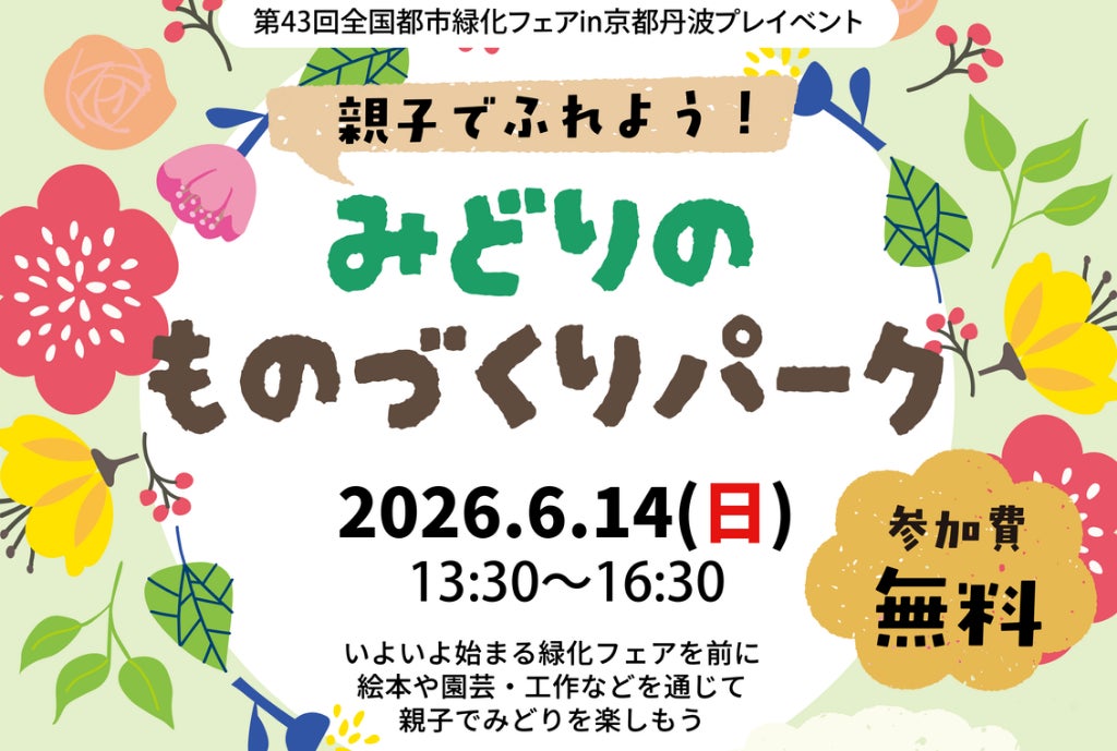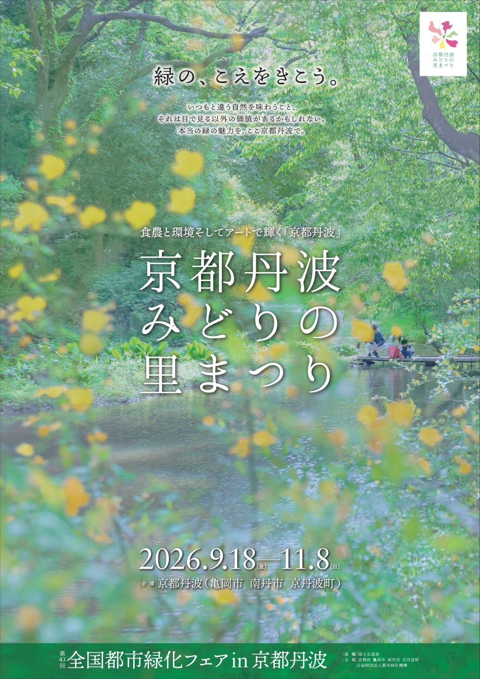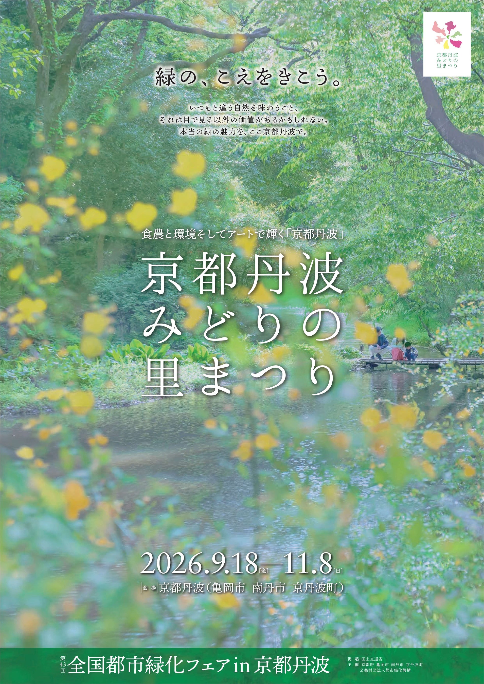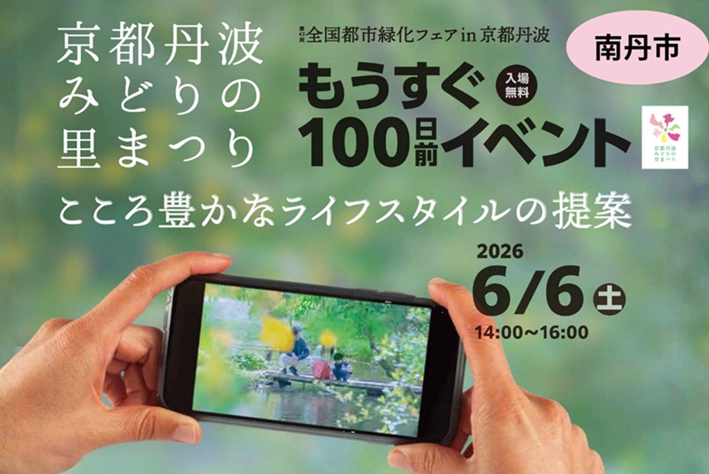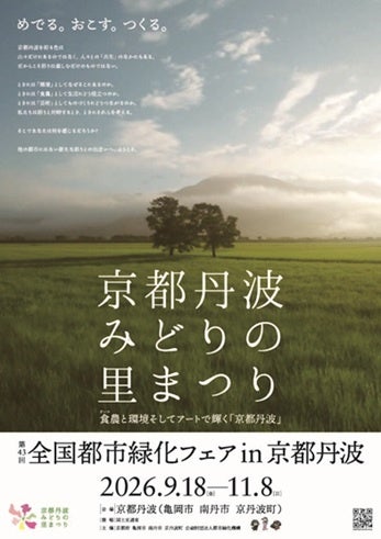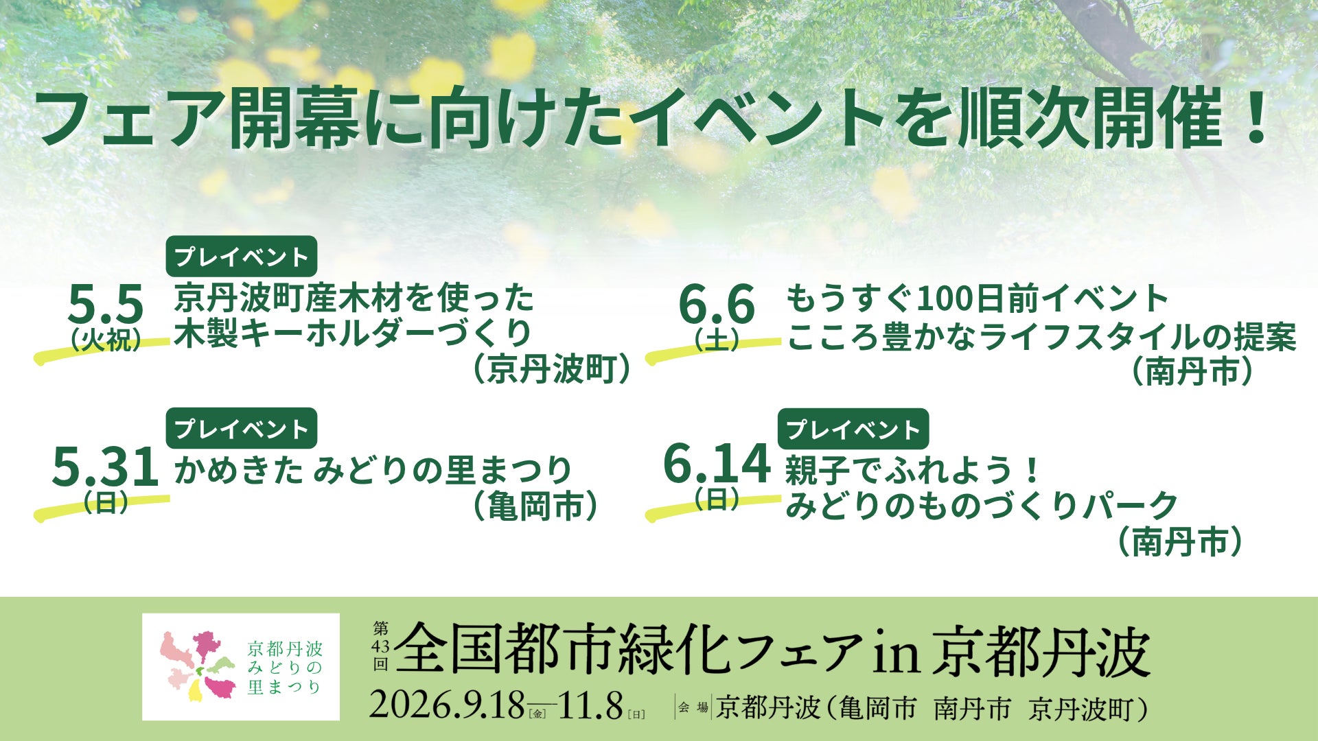 第43回全国都市緑化フェアin京都丹波実行委員会(会長:桂川孝裕・亀岡市長)は、令和8年9月18日から11月8日にかけて開催する「第43回全国都市緑化フェアin京都丹波~京都丹波みどりの里まつり」の開催機運を高めるため、京都丹波地域(亀岡市、南丹市、京丹波町)を舞台に、開催テーマ「食農と環境そしてアートで輝く『京都丹波』」を体感できる3つのプレイベントと「もうすぐ100日前イベント」を5月5日より順次開催します。