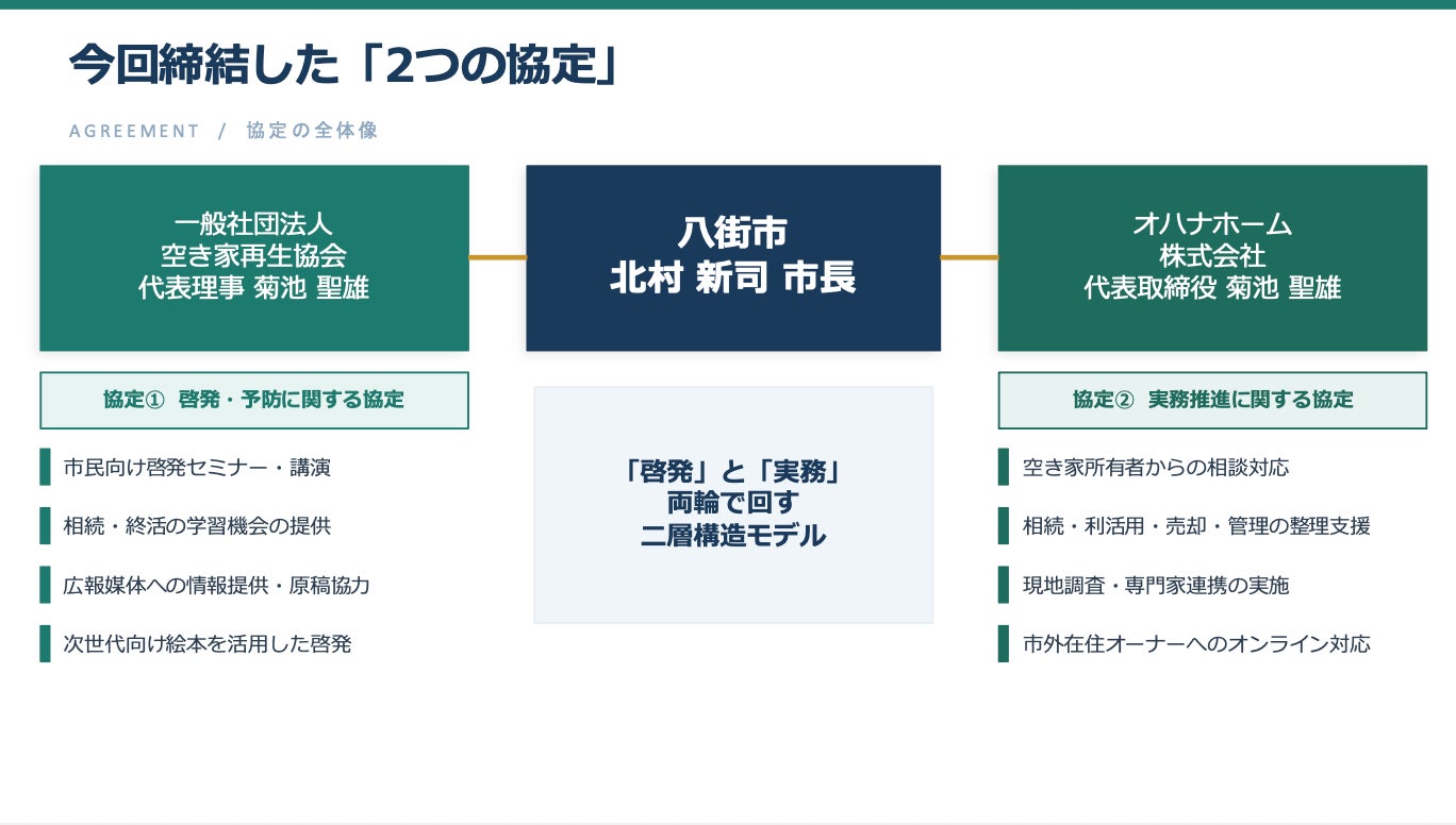 本協定により、一般社団法人空き家再生協会が空き家に関する啓発・予防活動を担い、オハナホーム株式会社が実務対応を担うことで、相談から解決までを一貫して支援する体制を構築します。