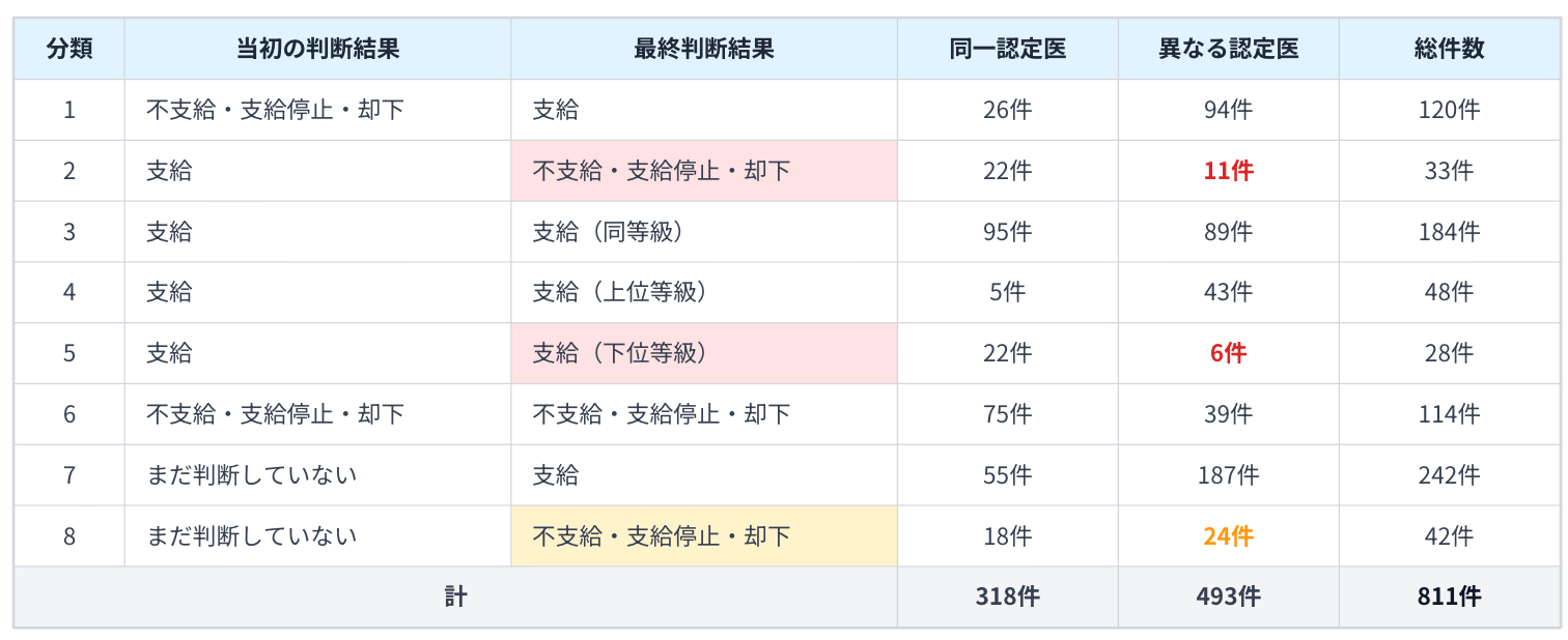また、約7,500件のうち、認定が終了し障害年金センターで原議が確認できる令和7年10月以降分の全ての認定調書が811件あり、その中で、当初「支給」とされていた判断が、最終的に「不支給または下位等級」に変わってしまったケースが17件あったとのことです。加えて「まだ判断していない」から不支給になったケースを含めると41件に上ります。