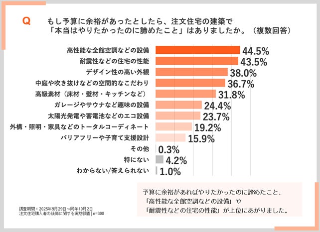 結果として、自分達が思い描いた理想の住宅や生活を後悔とともに実現できない状況に追い込まれています。弊社が2025年9月に実施した【注文住宅購入者の後悔に関する実態調査】によれば、予算の制約で本当はやりたかったのにあきらめたことで、住宅にとって重要な設備や性能を挙げています。