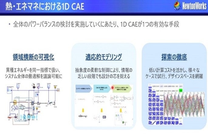 3D CAEと対比させて1DCAEという1次元の1Dという意味でもありますが、「1D」は一次元という意味を超え、「物事の本質をシンプルに表現し、見通しを良くする」という設計の考え方で、形状がない設計上流でシステム全体を俯瞰してシミュレーションする手法です。