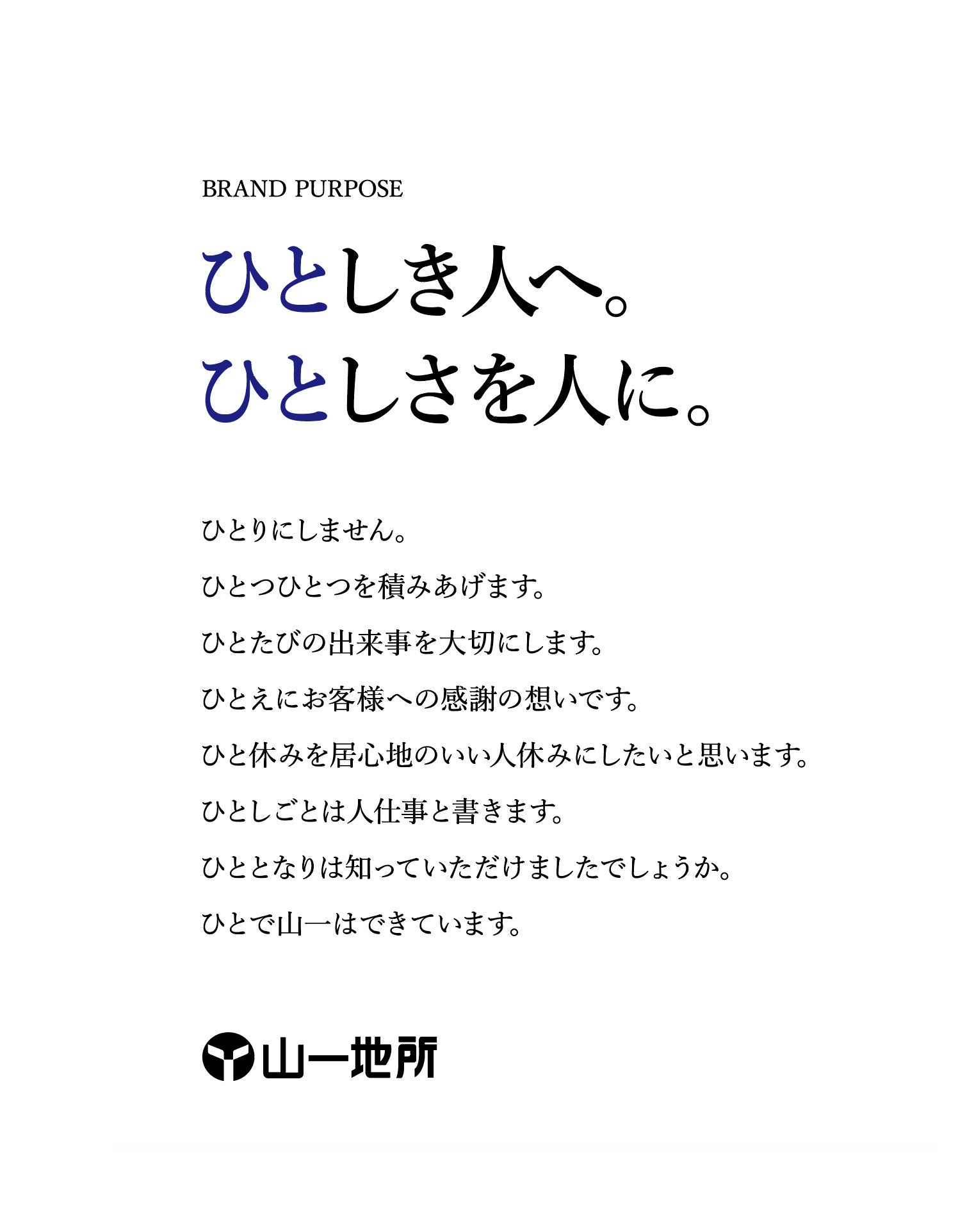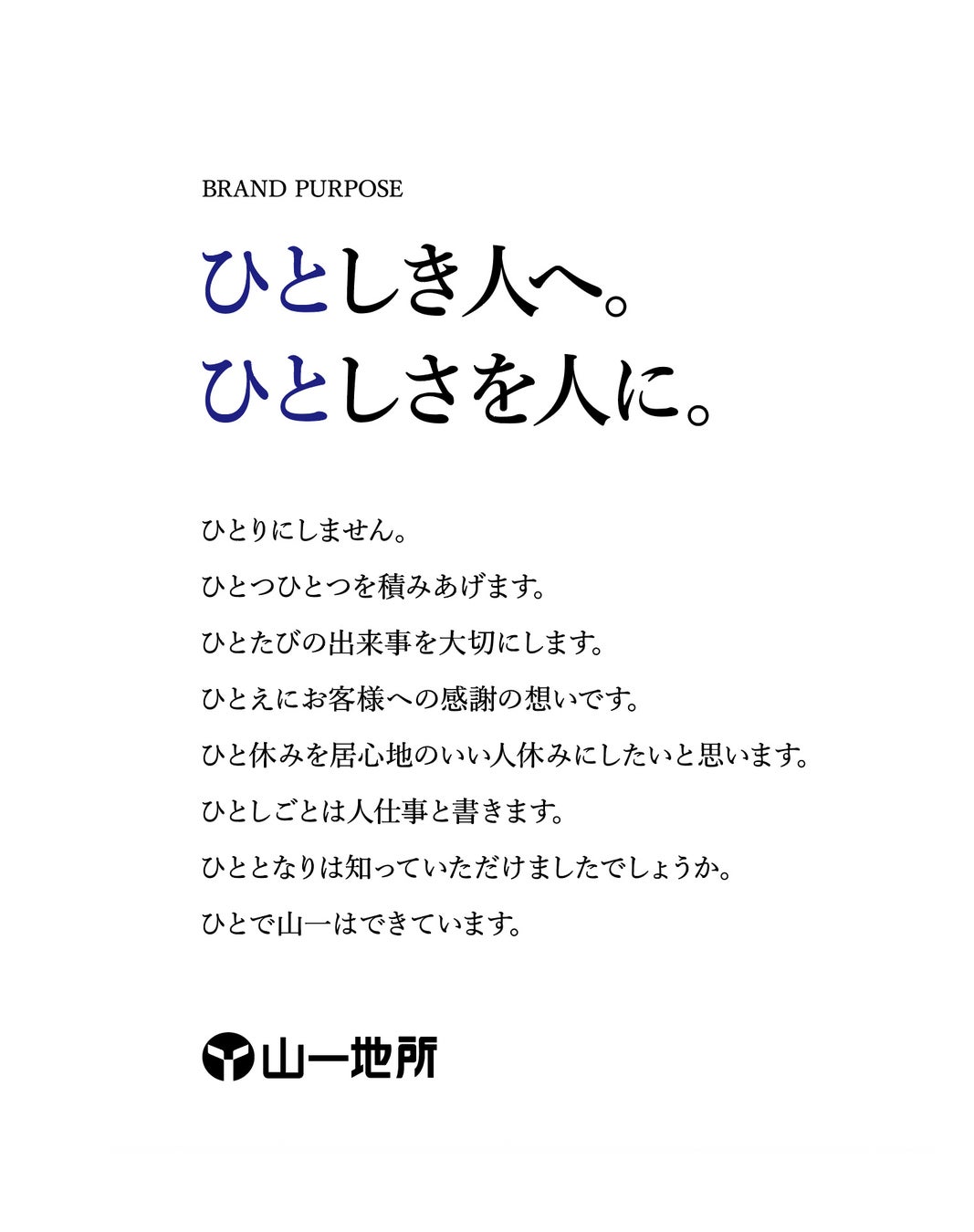 山一地所の「ひとしさ」は、デザインや広告の中だけで完結するものではありません。社員が日々の仕事の中で語り、顧客と接するその瞬間に宿る、“人の営みとしてのブランド”です。そのため、このパーパスは「完成」ではなく、企業と共に育っていく存在として位置づけています。