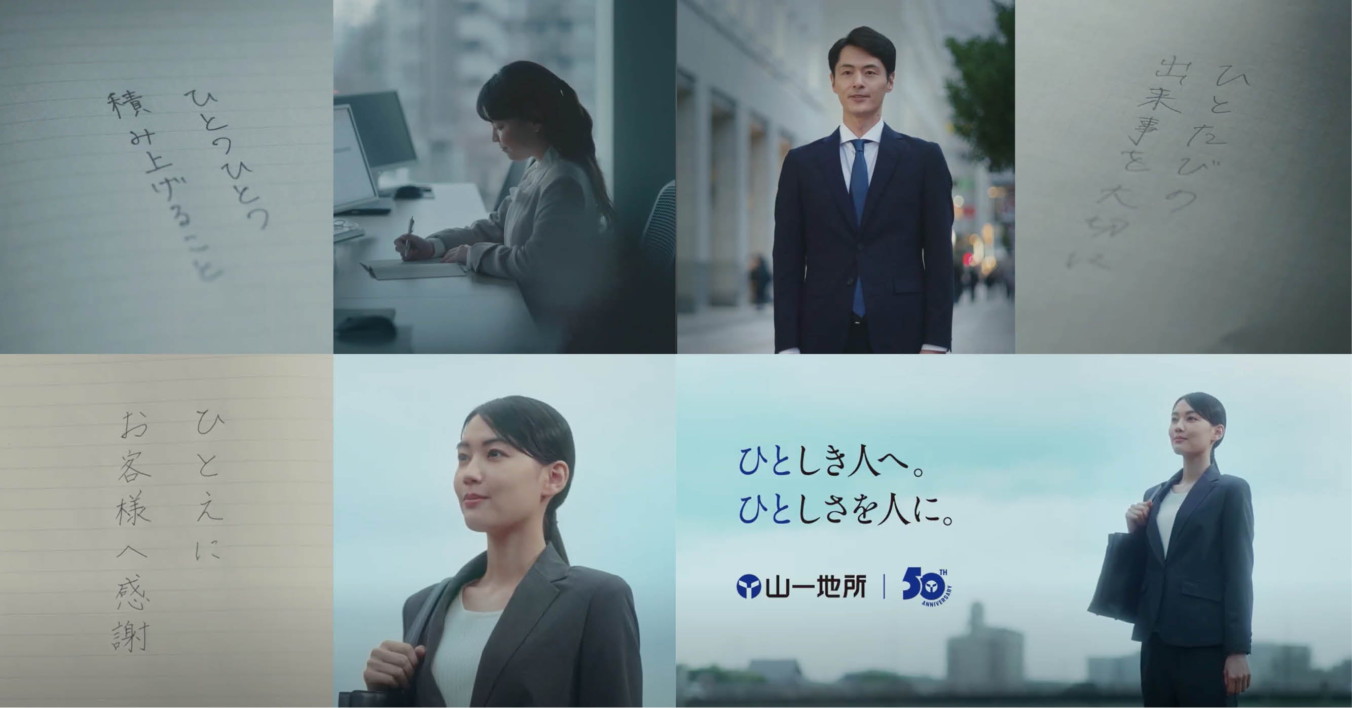 山一地所の50周年CMでは、“ひとしさ”が人の佇まいやまちの景色の中にそっと息づくように描かれています。