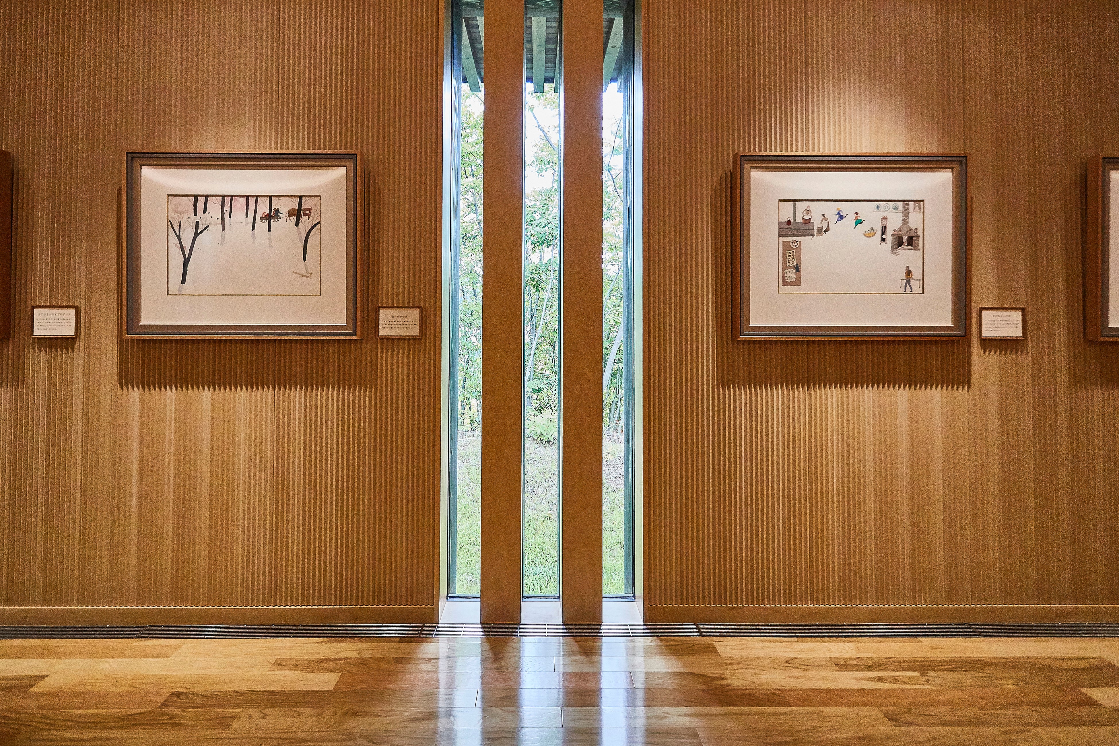 森の中に佇む安野光雅館は、画家・絵本作家である安野光雅氏の作品を展示する美術館です。森に抱かれるようにひっそりと佇む建築は、安藤忠雄氏の設計によるものです。美術館へと続く長い回廊や、周囲の景観に溶け込む杉板張りの外壁、わずかな開口部から差し込む光とともに、自然を感じながら作品をご鑑賞いただけます。