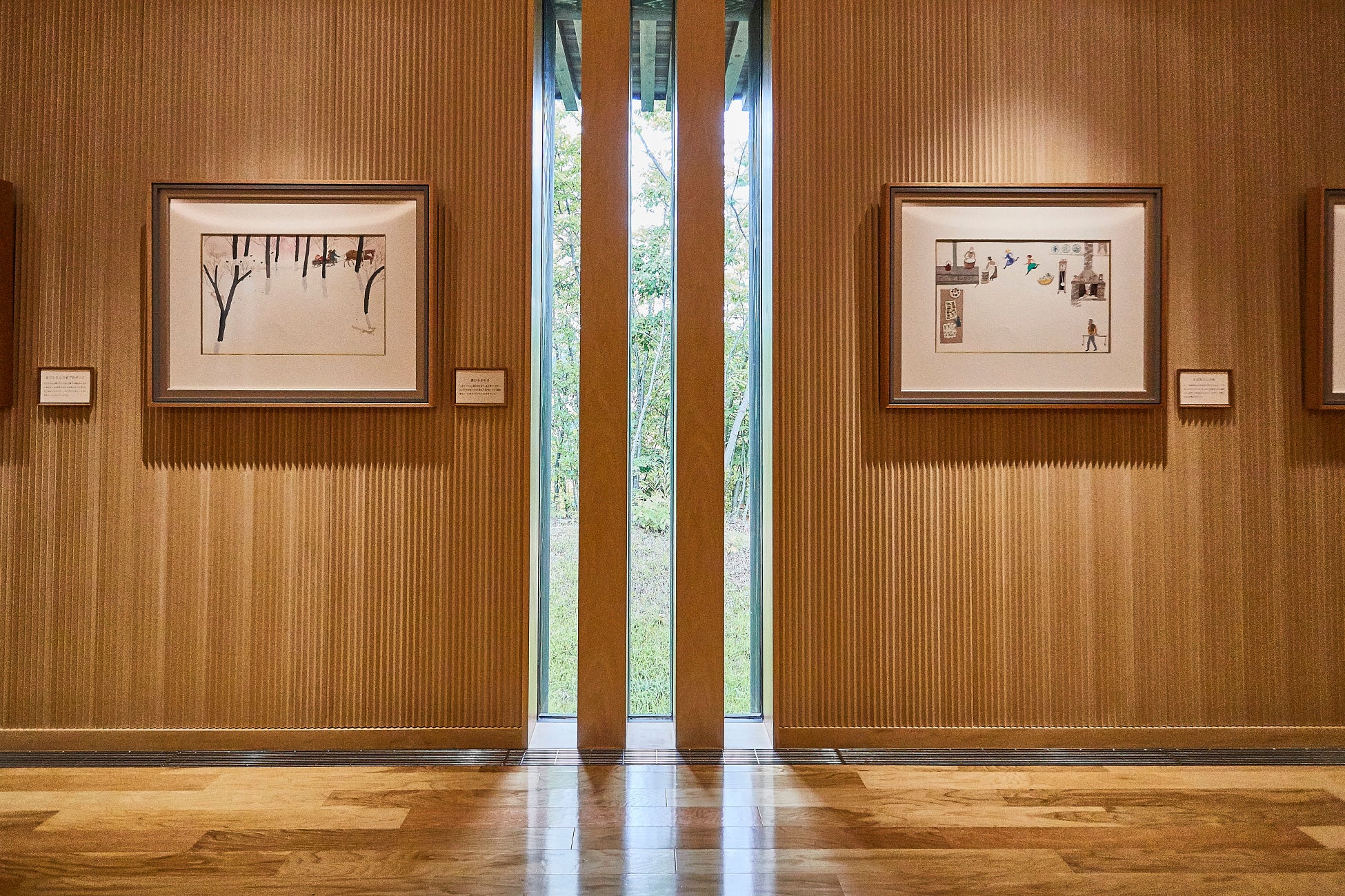 繊細でやわらかな水彩画の世界と、建築空間、そして森の環境が響き合い、次に現れる風景への期待を抱きながら、静かに芸術に向き合う時間が広がります。