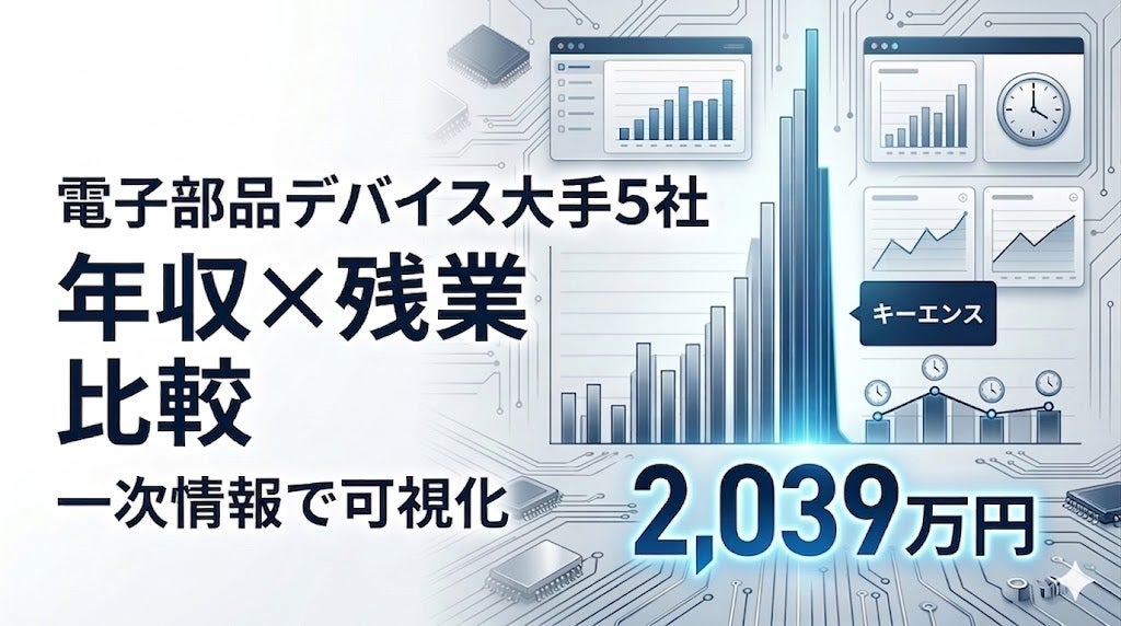 スマートフォン・EV・IoT機器を支える電子部品デバイス業界は「高収入」のイメージが先行しがちですが、就活・転職の企業研究では、年収だけでなく「どのような働き方で報酬が構成されているか(成果主義・長期安定・公私峻別等)」まで含めた理解が重要です。本リリースでは、年収と残業の両面から、大手5社の"稼ぎ方・働き方"の違いを整理します。