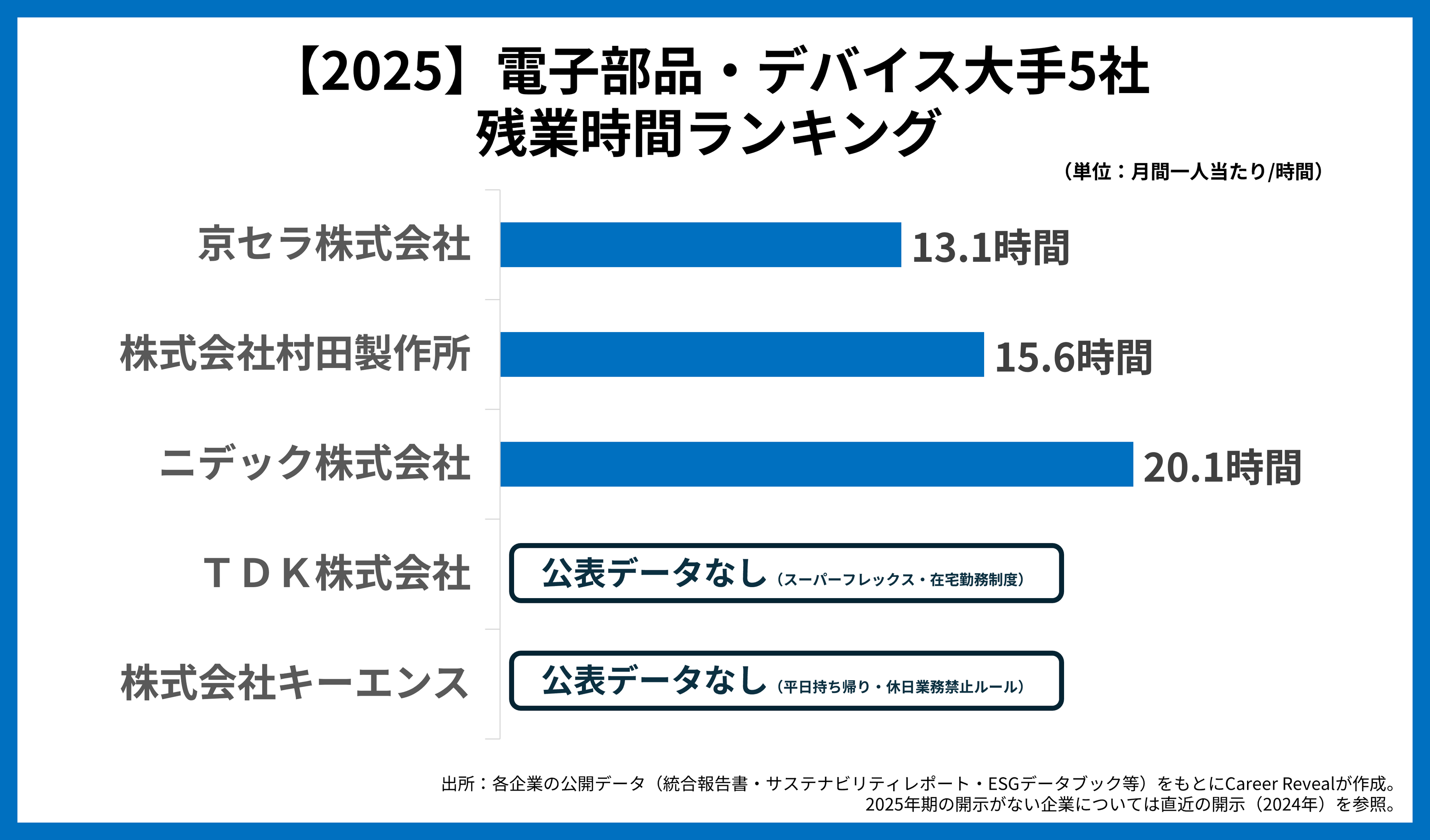 ※業界平均残業時間(14.35時間)は、2025年期に残業時間を公表している2社(京セラ・村田製作所)の平均値です。ニデックは2024年期(20.1時間)のため含まず、3社の単純平均は16.27時間となります。TDKおよびキーエンスは非公表のため、5社全体の平均を示すものではありません。