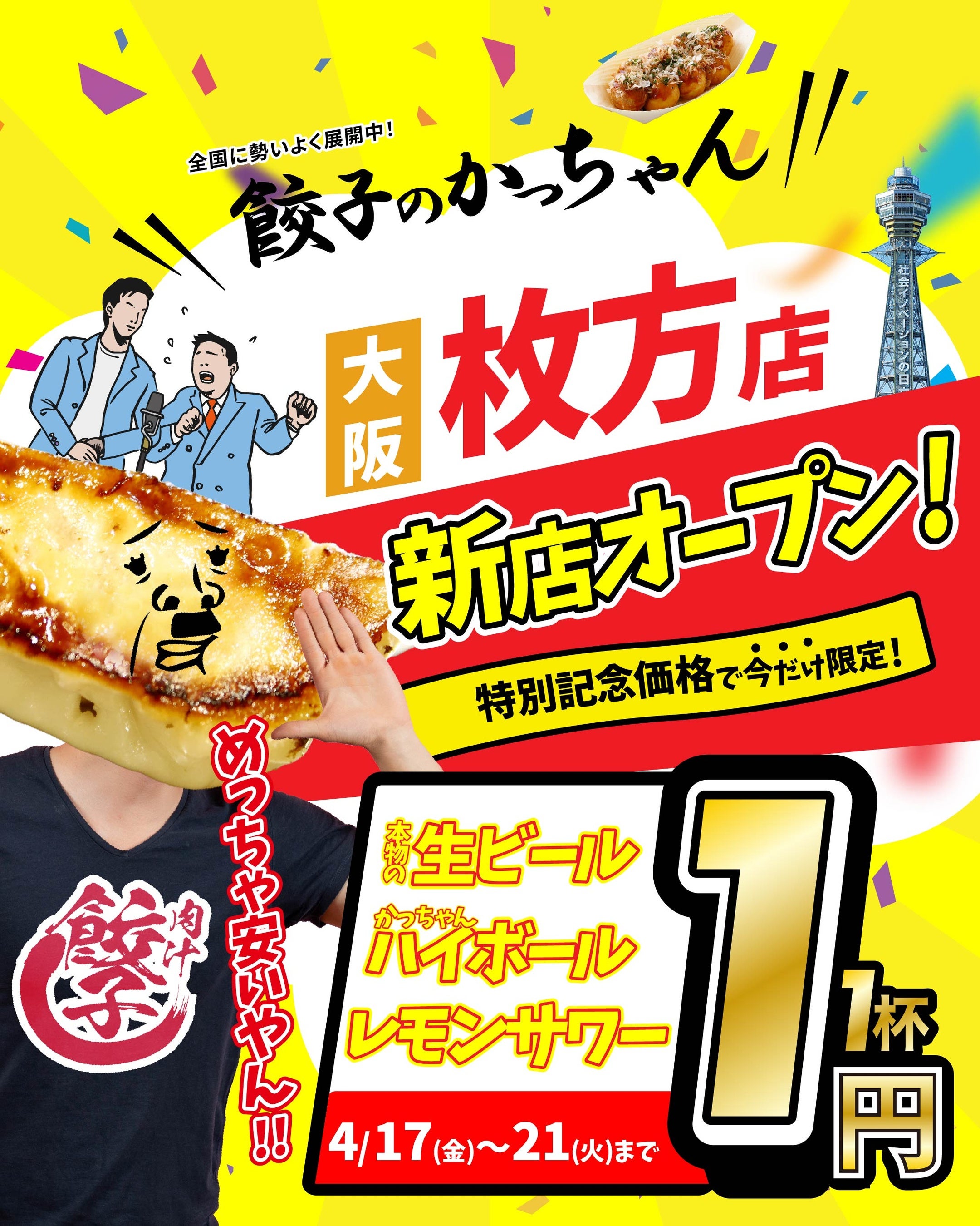 【新店情報】『肉汁製作所 餃子のかっちゃん 枚方店』が4月17日(金)にオープン!生ビールと人気アルコール1円キャンペーン!!