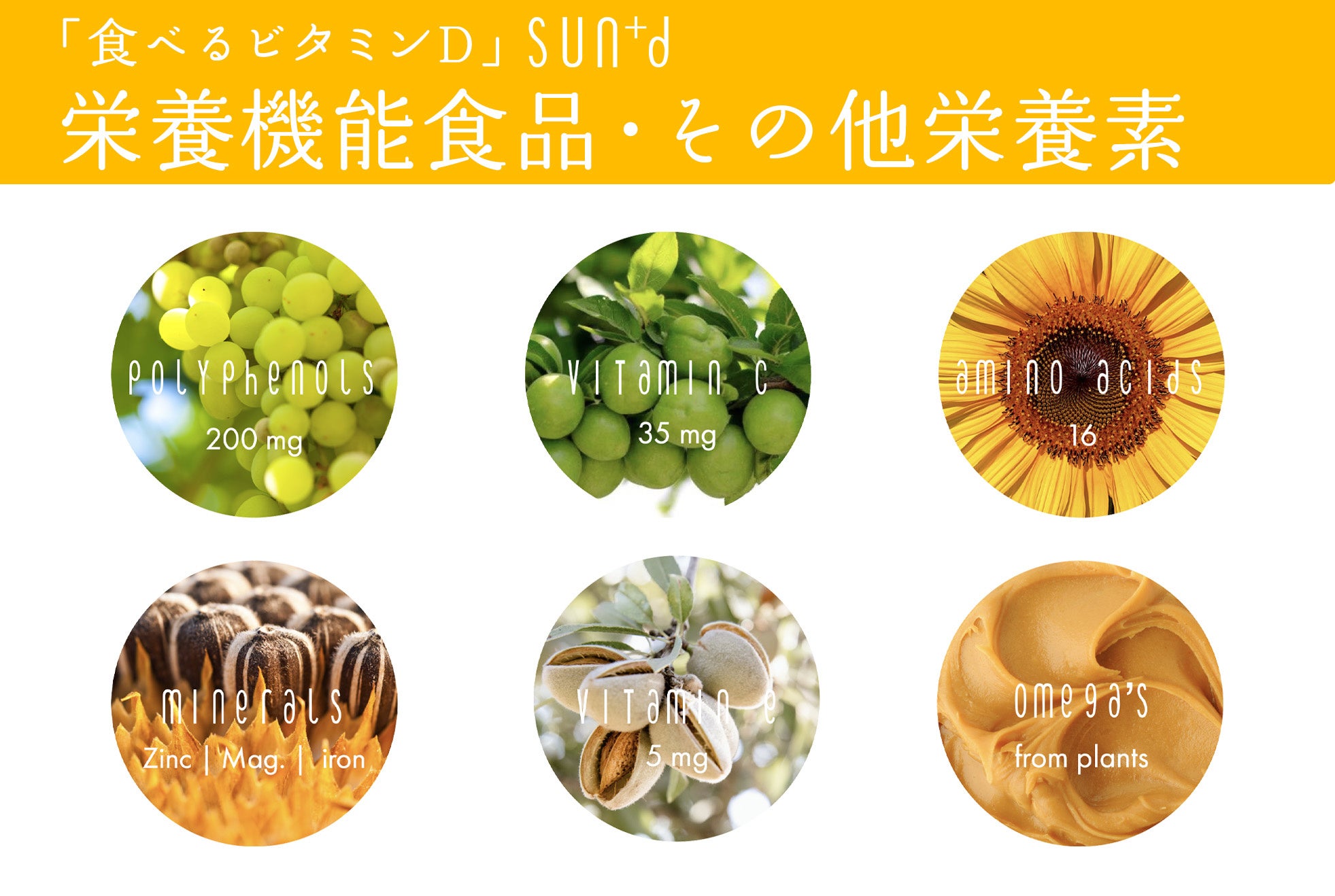 SUN+dは、ミネラル、ビタミン、アミノ酸を豊富に含んだ「ひまわりの種&アーモンドペースト」を中心に、希少な自然界のビタミンD食材海藻「アルジア」、自然界でNo.1を誇るビタミンC含有量と言われるスーパーフード「カカドゥプラム」など、豊富な栄養素がぎゅっと詰まった栄養機能食品。