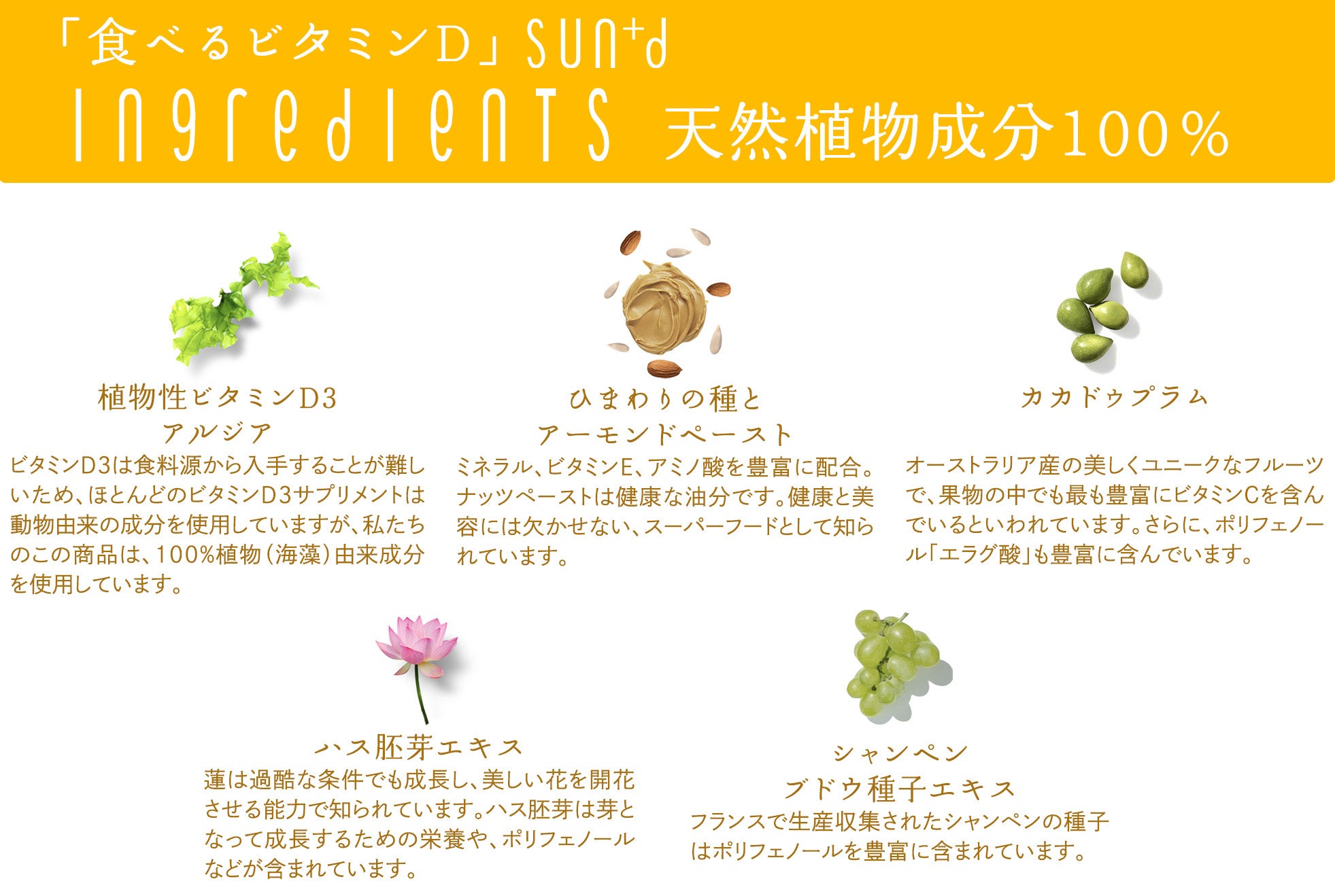 毎日美味しく食べてほしいから、SUN+dは、ビタミンDの栄養機能食品にありそうでなかった、天然植物素材100%でできています。