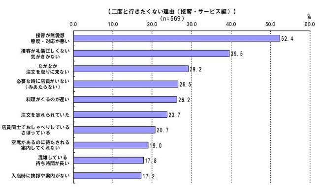 気がきかない」など接客の基本姿勢に関するものが上位を占める結果となりました。