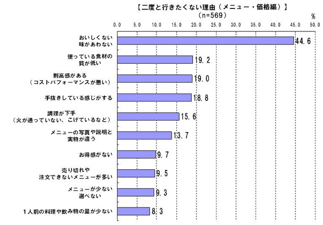 メニューや価格などによる理由では、「おいしくない、味があわない」が圧倒的に多く、その原因