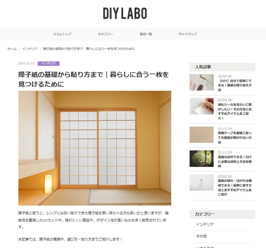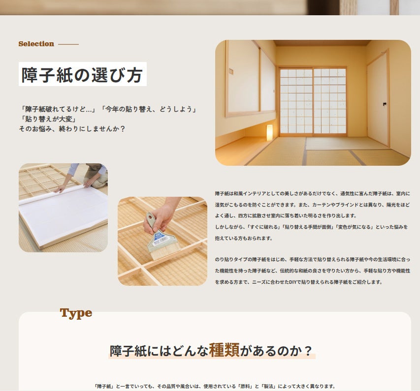 障子紙は日本の住まいに欠かせない伝統的な建具であり、冬の寒さ対策や室内の雰囲気作りに重要な役割を果たします。貼り替えのタイミングで「どの障子紙を選べばよいか」「どう貼ればよいか」といった疑問を持つ方が多く、今回の特設ページはそうしたニーズにお応えするものです。