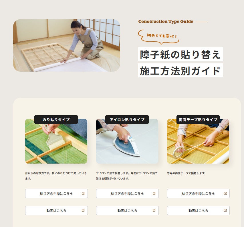 貼り方には、従来通りの障子のりで貼る「のり貼りタイプ」やアイロンの熱で接着する「アイロン貼りタイプ」、専用の両面テープで貼る「両面テープ貼りタイプ」といった貼り方もあり、HOWTOはもちろん、必要な道具についても紹介しております。