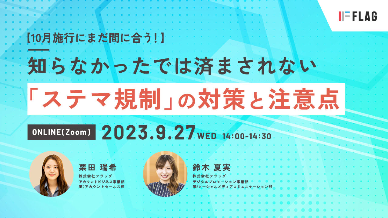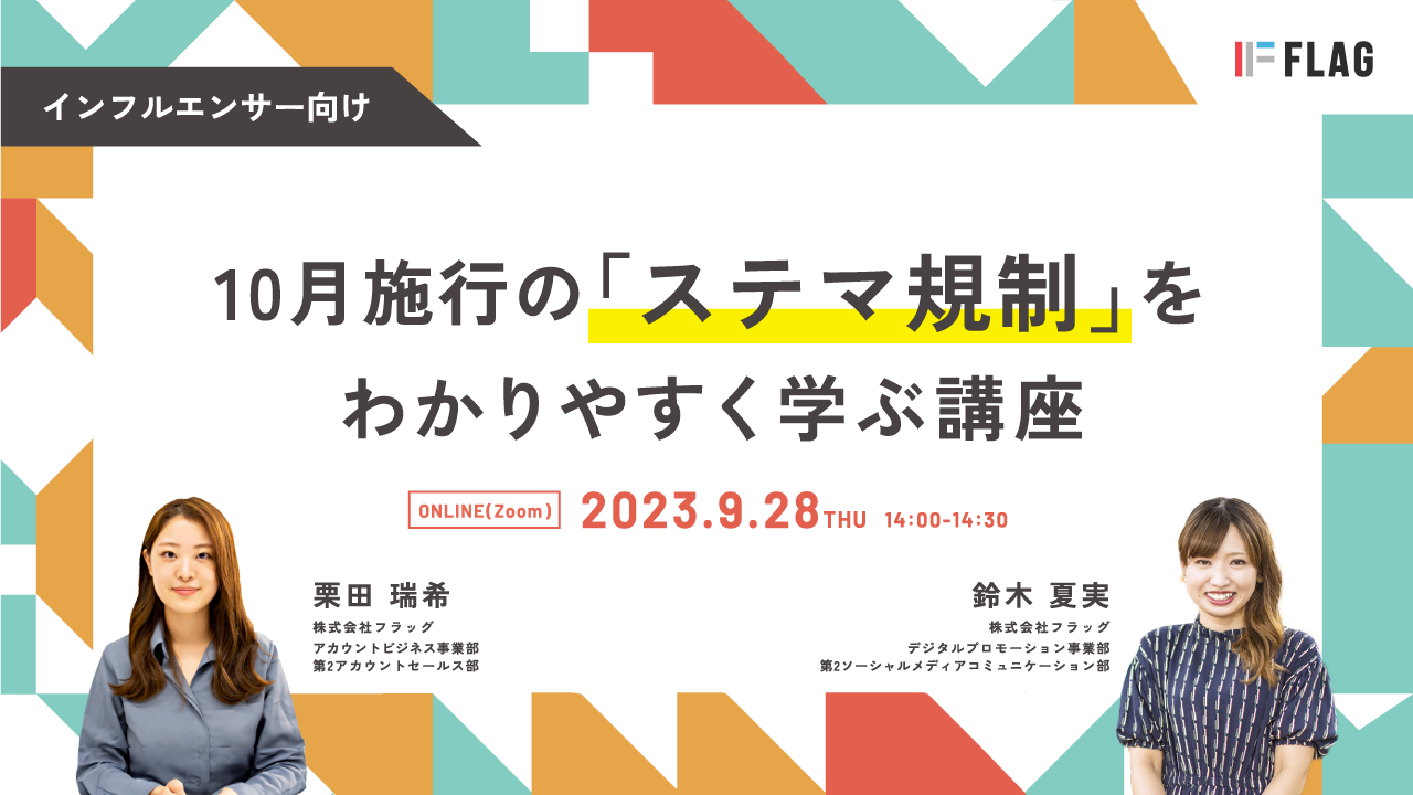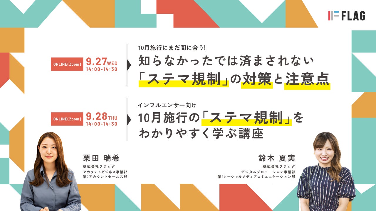 本セミナーでは、これまでに多数のSNS・インフルエンサーマーケティングを手がけ、一般社団法人クチコミマーケティング協会(WOMJ)の会員でもあるフラッグが、ステマ規制の基礎や事例をおさえた上で、正しい施策を行うためのポイントをわかりやすく解説いたします。