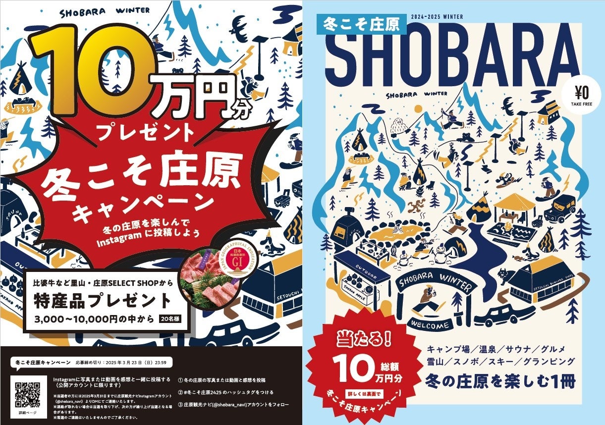 (一社)庄原観光推進機構は総額10万円分のプレゼントが当たる「冬こそ庄原キャンペーン」を3月23日(日)まで展開するとともに、冬の庄原を楽しむためのパンフレット・特設ページを作成しました。