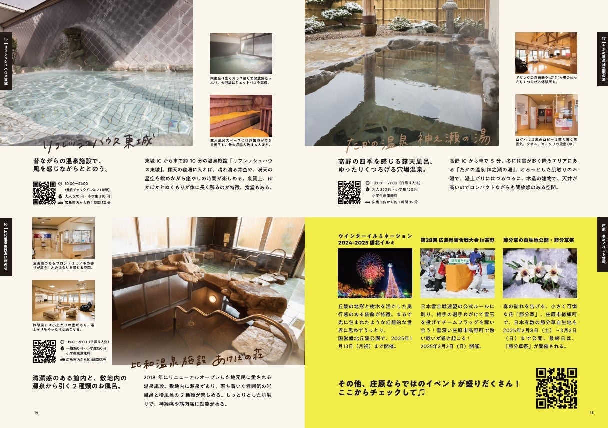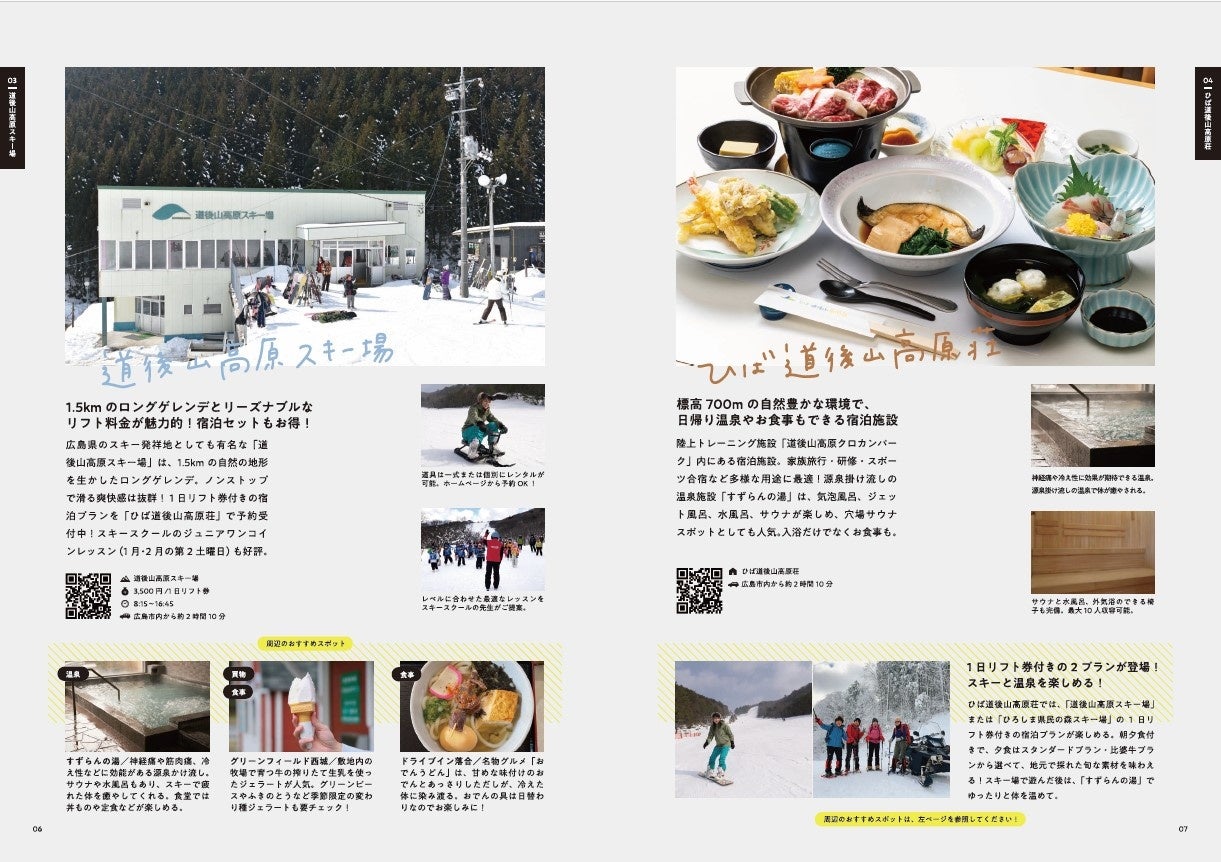 冬こそ庄原パンフレット・特設ページ内では、「ひろしま県民の森スキー場」で新たに動く歩道「ラクナンデ」を導入など各スキー場の最新情報やお得な情報、トピック、1日リフト券付きの宿泊プラン、雪中キャンプが楽しめるキャンプ場、備北イルミなどの庄原の冬の魅力をギュッとつめこんでご紹介しています。