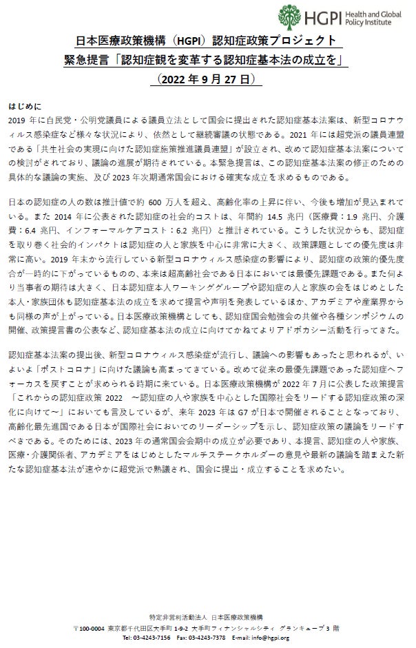 特定非営利活動法人日本医療政策機構(HGPI: Health and Global Policy Institute)(事務局:東京都千代田区、代表理事:黒川清)は、認知症基本法案に対する緊急提言「認知症観を変革する認知症基本法の成立を」を公表しました。