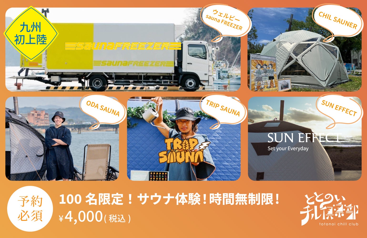 九州初上陸のサウナトラック「ウェルビーsauna FREEZER」や九州で人気のテントサウナが集結します。