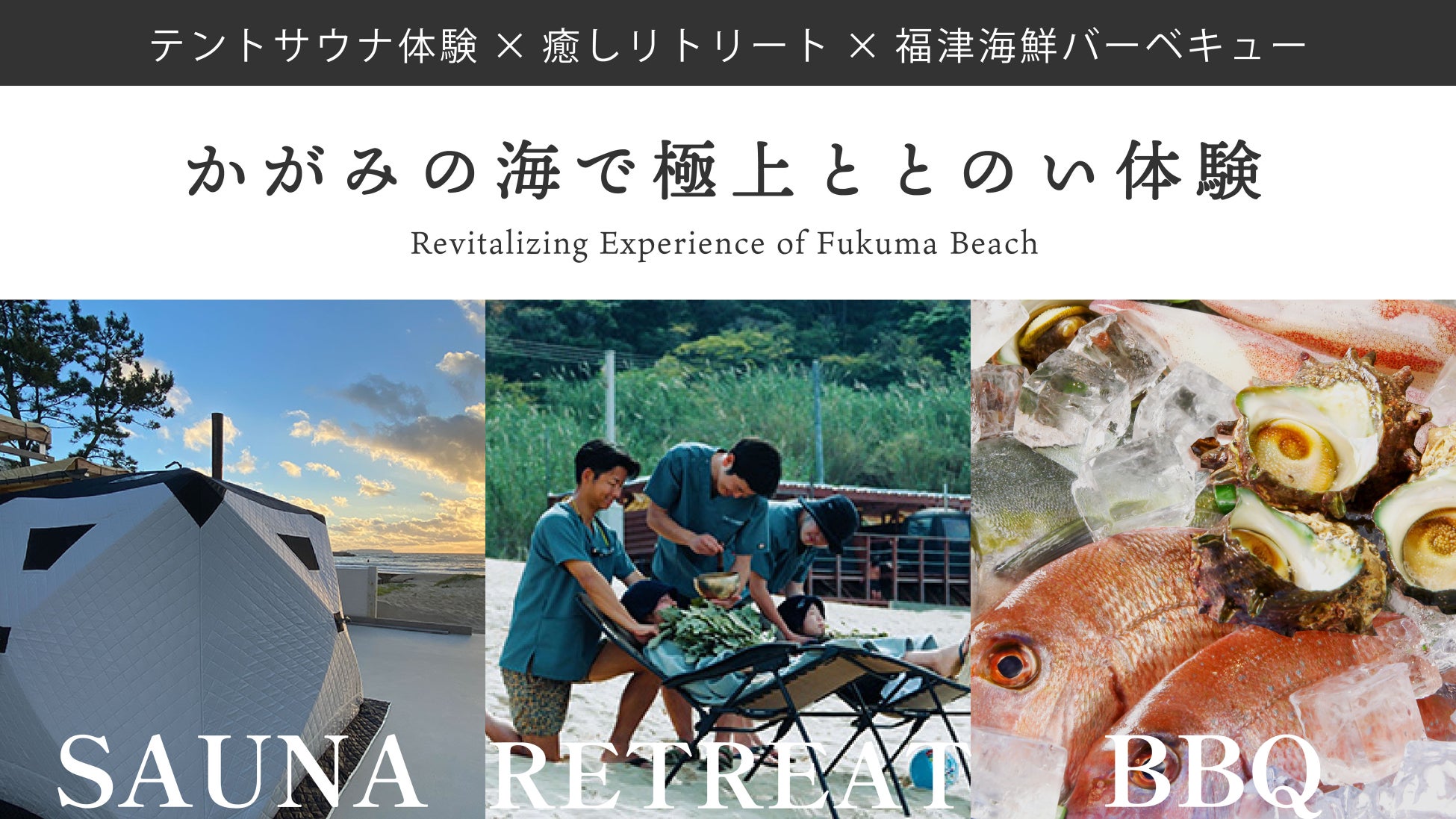 そんな絶景ロケーションを望みながら「サウナ体験」「リトリート体験」「福津海鮮バーベキュー」を一度に味わえる、極上ととのい体験の販売がスタートします。