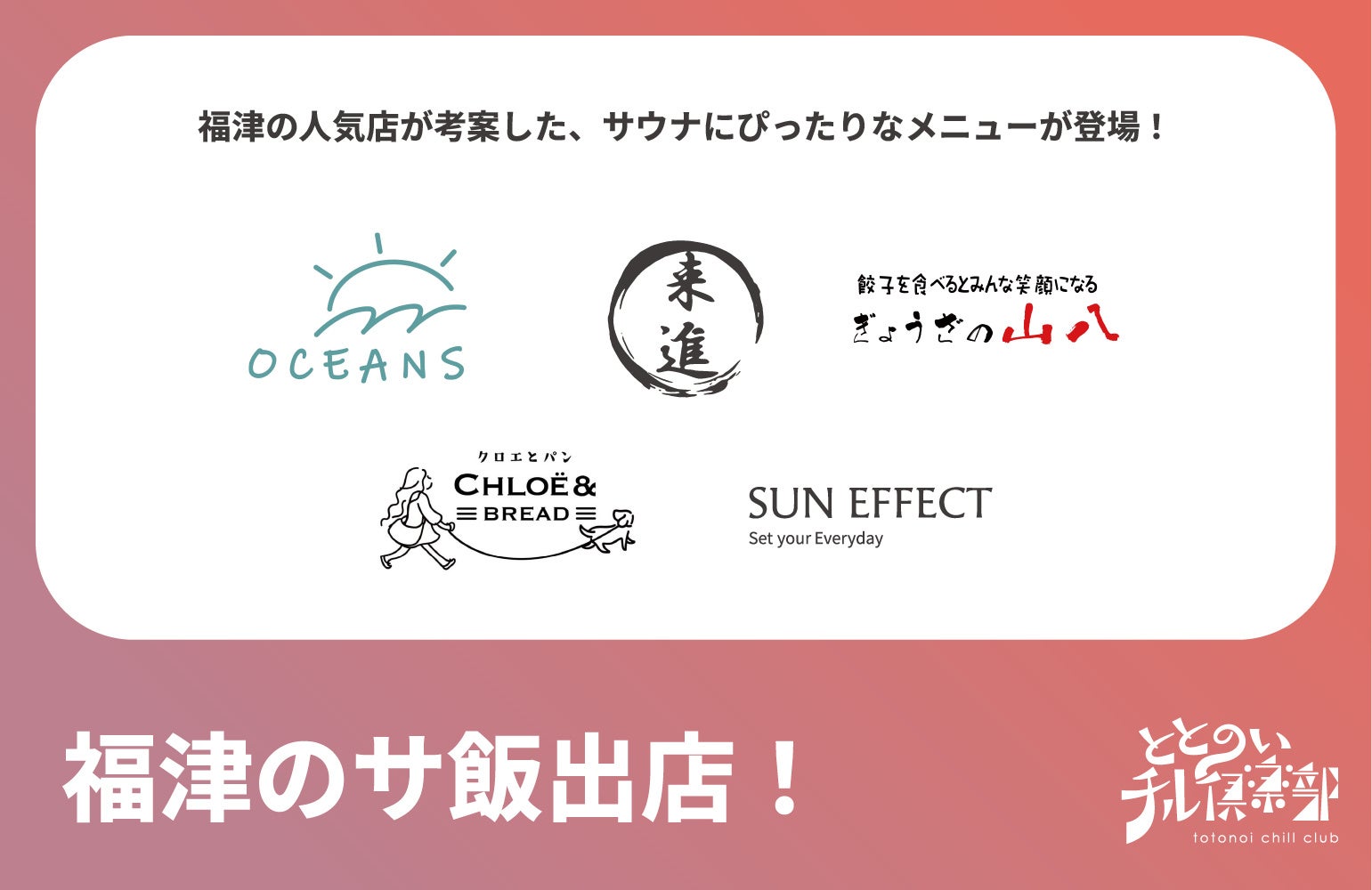 SUN EFFECT、漁師めし 来進、OCEANS 、クロエとパン、ぎょうざの山八