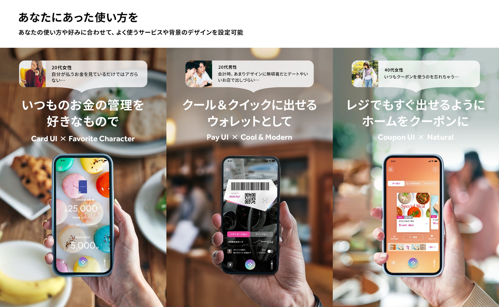 新しい「イオンウォレット」では、クレジットカード、コード決済、ポイントなど多岐にわたるサービスから、生活やライフステージに合わせ、ユーザーにパーソナライズできるような機能を持っています。それにより、サービスが多数表示される複雑なアプリ設計でなく、シンプルなUIと、支払いやクーポンなど使いたい時に素早く利用できるように設計されています。