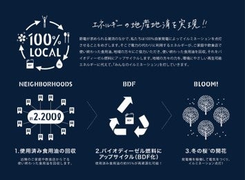 本イルミネーションは、地域の飲食店やご家庭から出た使用済み食用油を再生し、バイオディーゼル燃料として活用するサステナブルな取り組みです。再生された電力で、“冬の桜®(桜色のイルミネーション)”を目黒川沿いの約2.2km(両岸合計総延長)に灯します。