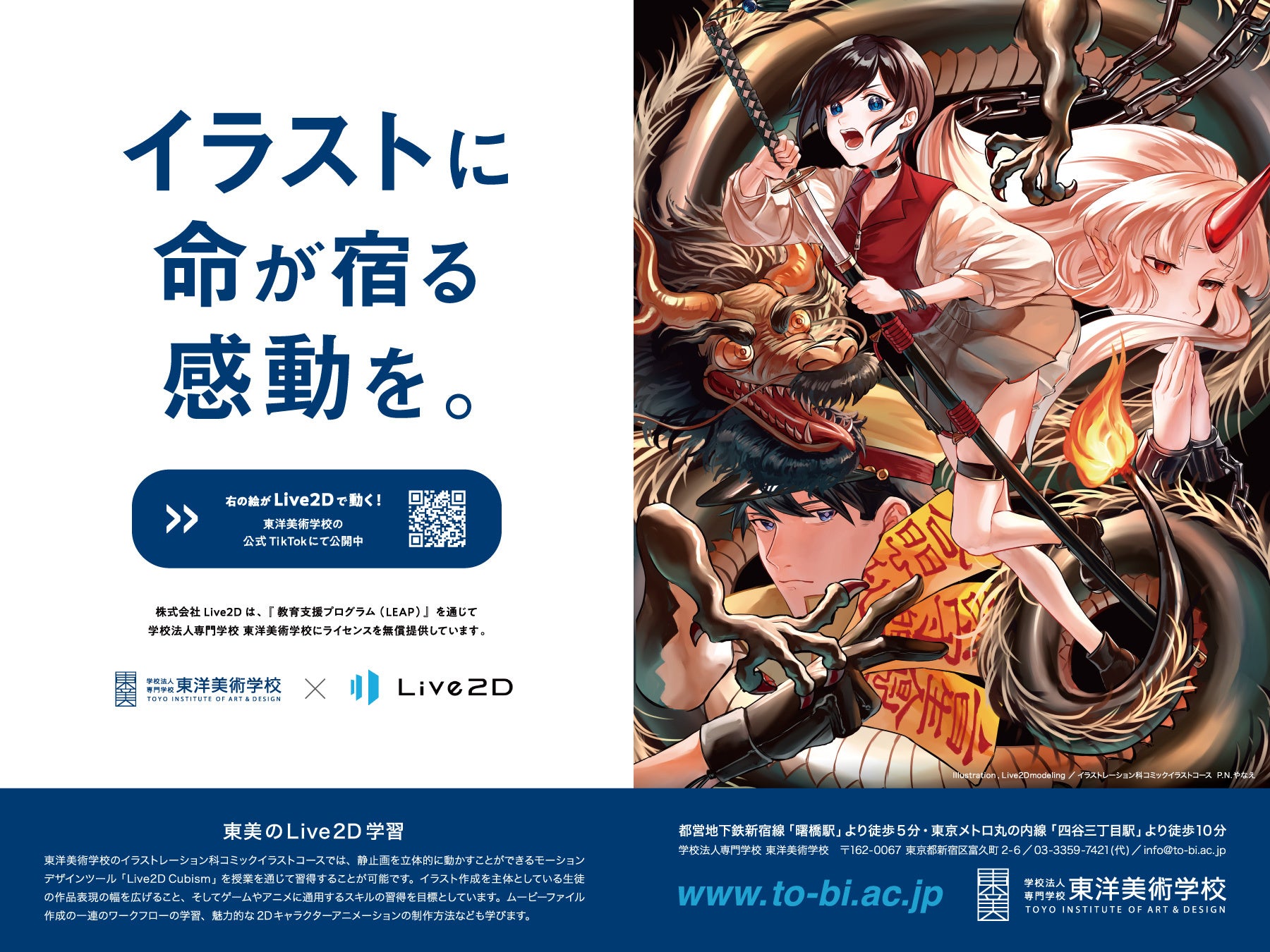 学校法人専門学校 東洋美術学校(本社:東京都新宿区、校長:中込三郎、以下、本校)は、2Dイラストに立体的なアニメーションを加える表現技術「Live2D(ライブツーディー)」の研究開発を中心に事業を展開している株式会社Live2D(本社:東京都新宿区、代表取締役:中城哲也、以下、Live2D社)と、産学連携(パイロットプロジェクト)で、2024年3月14日(木)より駅看板広告をJR秋葉原駅(京浜東北線 大宮駅方面ホーム)に掲出中です。