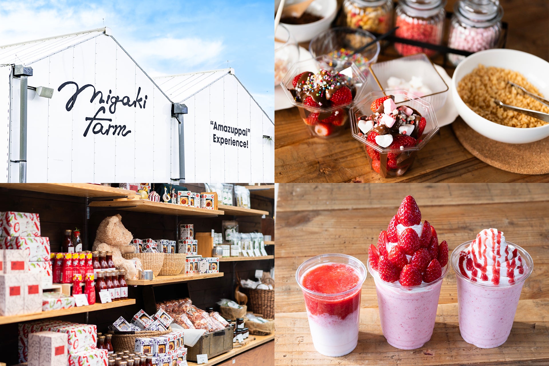 SHOPでは、新鮮な生いちごや、いちごのお菓子・飲料などの加工品に加え、日本各地の逸品を取りそろえたラインナップにリニューアル。CAFEでは、農場でとれた新鮮ないちごを使った、オリジナルメニューを提供いたします。ぜひ今後のMIGAKI FARMにご期待ください。