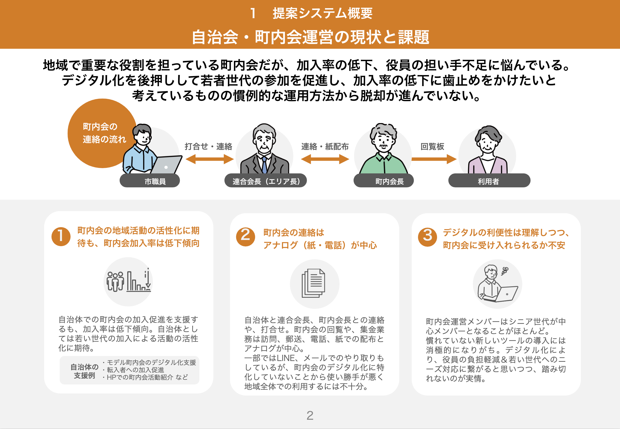 自治体職員と自治会役員間の情報伝達部分のデジタル化をまずは推進し、自治会・町内会への導入のイメージを把握してもらいます。