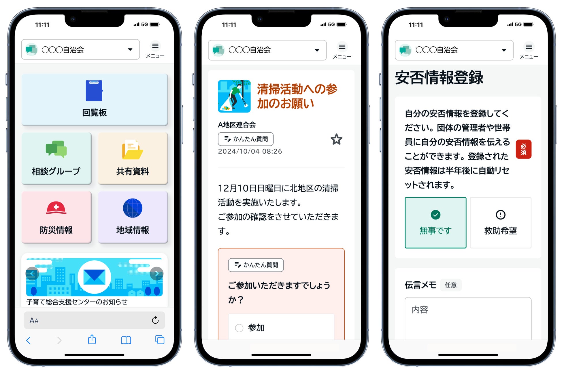 以下のような運営に必要な機能を取り揃えており、全国の自治体/自治会・町内会でご利用いただけます。