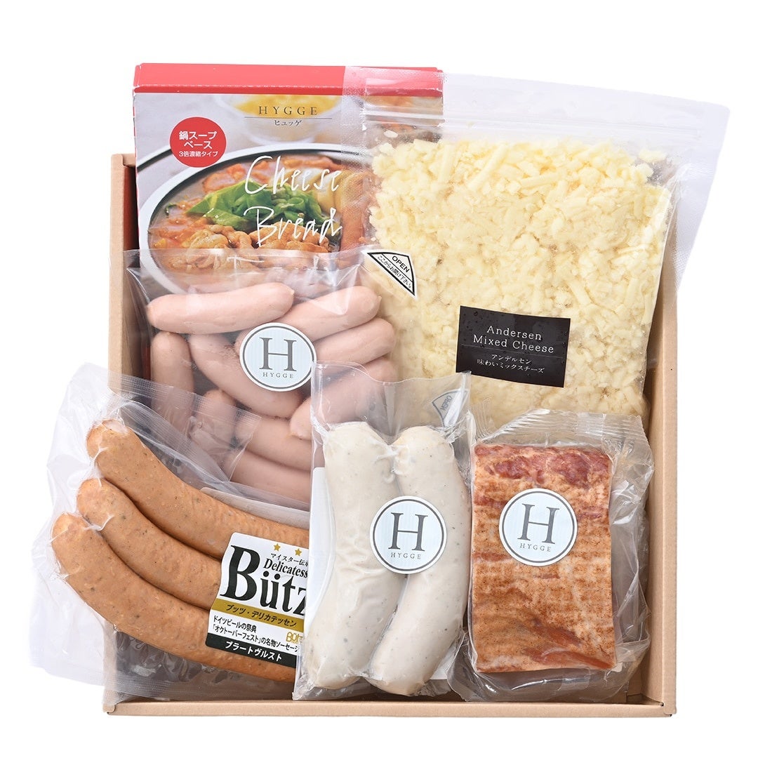 冬の人気商品「パン鍋フォンデュ」とウインナーやベーコン、チーズのセット。シンプルなフランスパンを用意して、今夜はパン鍋!